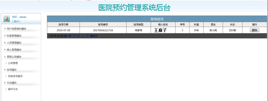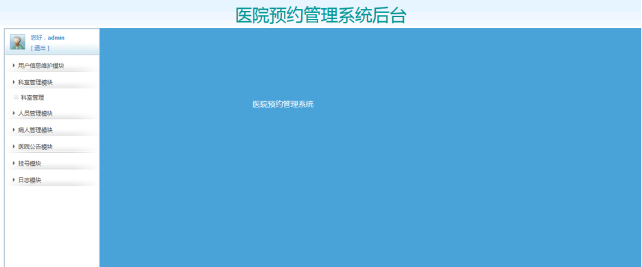 该模块可以完成修改用户密码、病人管理,公告管理,医生管理,科室管理以及退出系统等操作。