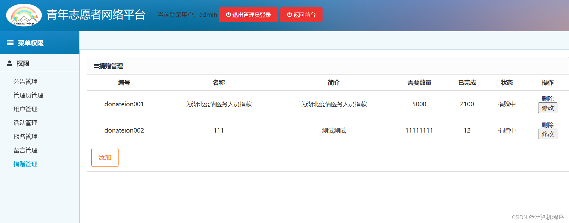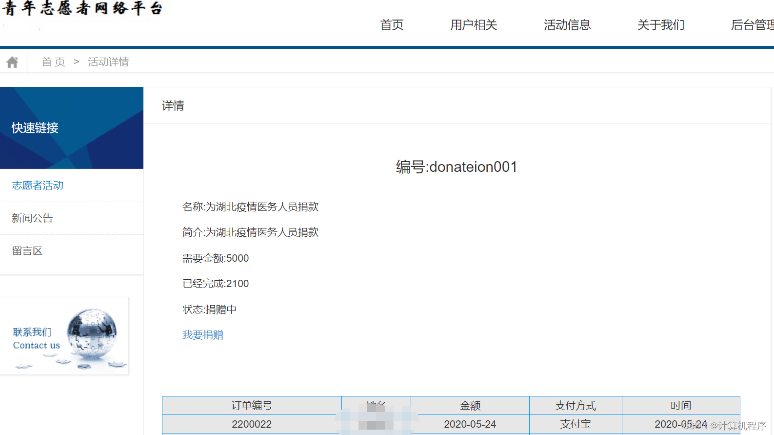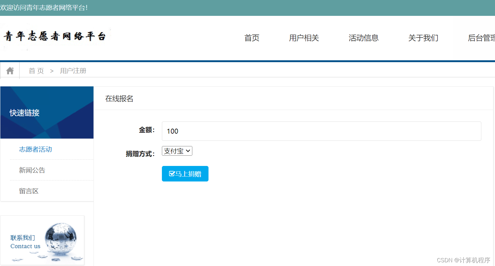 8月份由于公司的事情太多,基本上没有更新博客信息。今天稍微空了点,陆续为为大家介绍Java web项目,今天要介绍的是一个Java web编写的志愿者系统。志愿者系统通常是由非盈利组织或者政府机构建立和运营的,用于管理和协调志愿者的各种活动和服务。志愿者系统的主要功能包括志愿者招募、培训、分配任务、跟踪和评估志愿者的工作表现等。本次介绍的志愿者系统具备两类用户类型:普通用户和系统管理员。普通用户的功能包括:用户注册、登陆、查看活动、活动报名、活动捐赠、在线留言。系统管理员主要进行日常工作的维护,包括以下一些主要的工作:管理员管理、用户管理、活动管理、报名管理、捐赠管理、留言回复管理等功能。目前系统功能已经很全面,后续会进一步完善。整个系统界面漂亮,有完整得源码,希望大家可以喜欢。喜欢的帮忙点赞和关注。一起编程、一起进步。