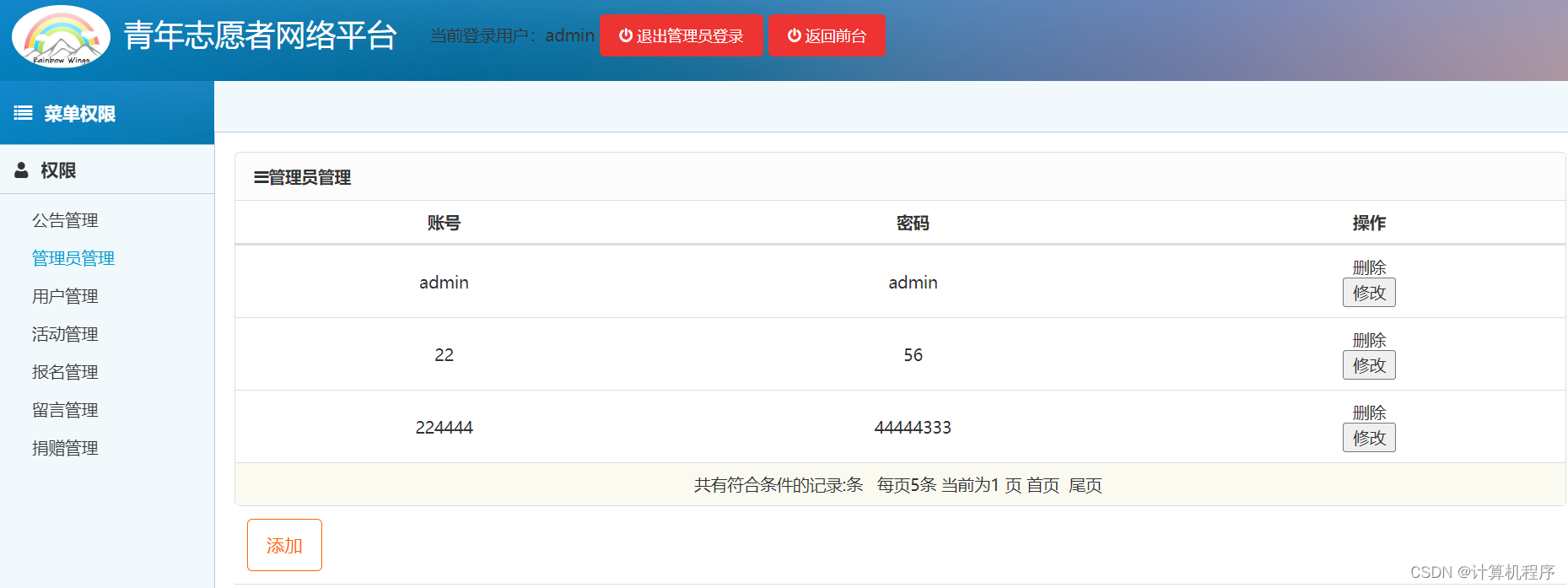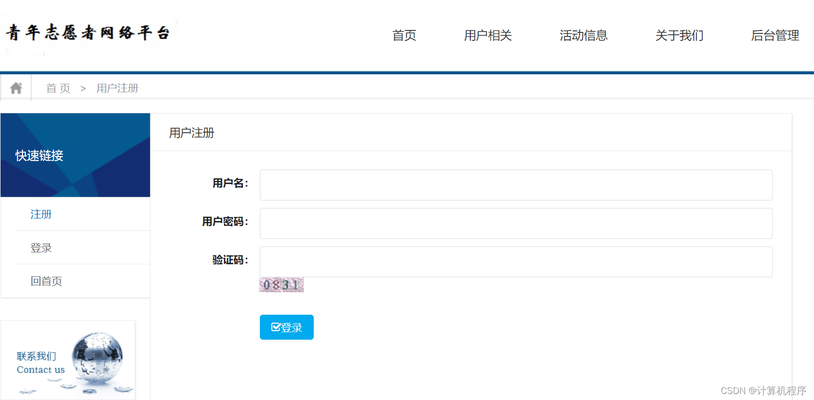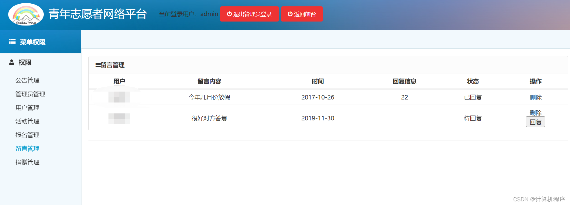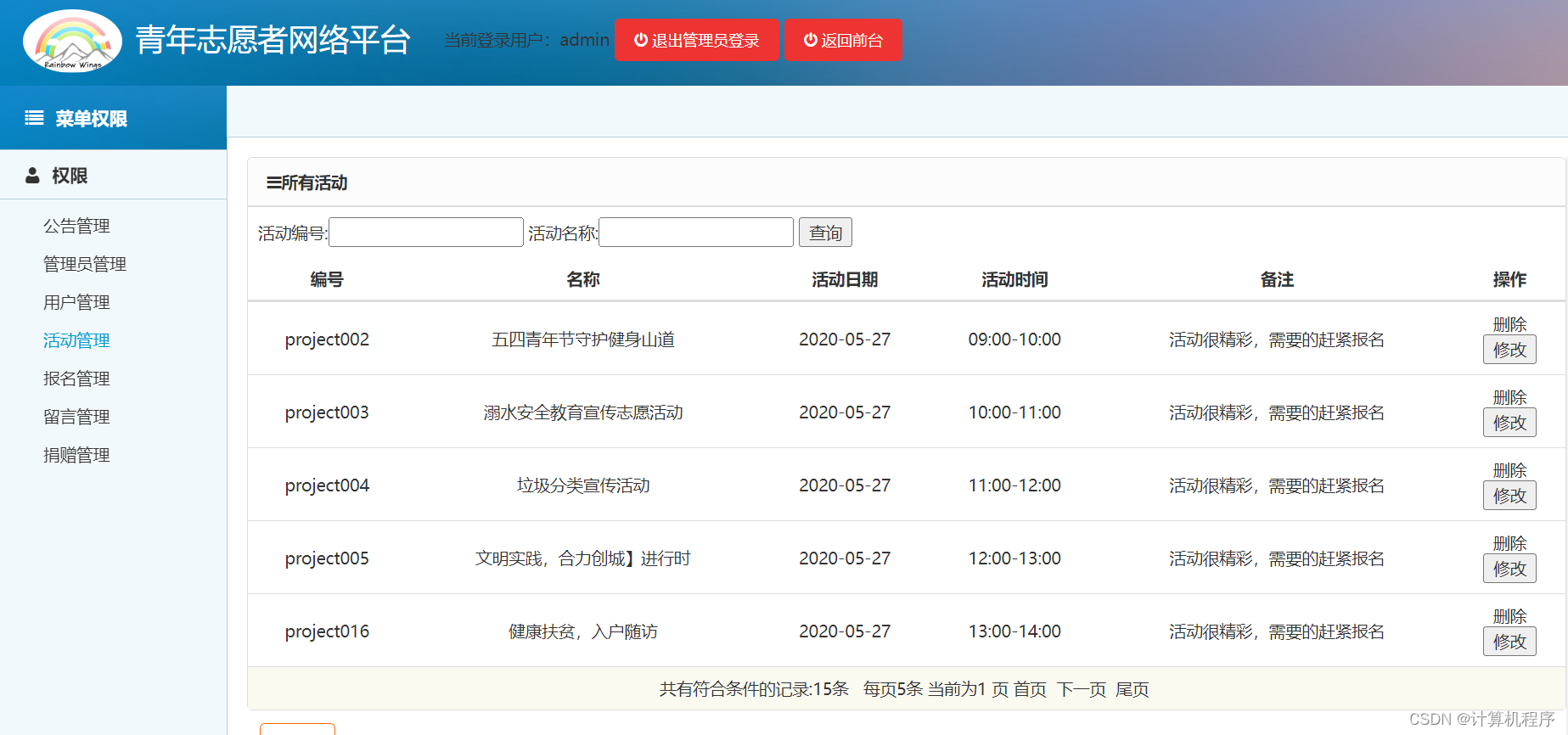 8月份由于公司的事情太多,基本上没有更新博客信息。今天稍微空了点,陆续为为大家介绍Java web项目,今天要介绍的是一个Java web编写的志愿者系统。志愿者系统通常是由非盈利组织或者政府机构建立和运营的,用于管理和协调志愿者的各种活动和服务。志愿者系统的主要功能包括志愿者招募、培训、分配任务、跟踪和评估志愿者的工作表现等。本次介绍的志愿者系统具备两类用户类型:普通用户和系统管理员。普通用户的功能包括:用户注册、登陆、查看活动、活动报名、活动捐赠、在线留言。系统管理员主要进行日常工作的维护,包括以下一些主要的工作:管理员管理、用户管理、活动管理、报名管理、捐赠管理、留言回复管理等功能。目前系统功能已经很全面,后续会进一步完善。整个系统界面漂亮,有完整得源码,希望大家可以喜欢。喜欢的帮忙点赞和关注。一起编程、一起进步。