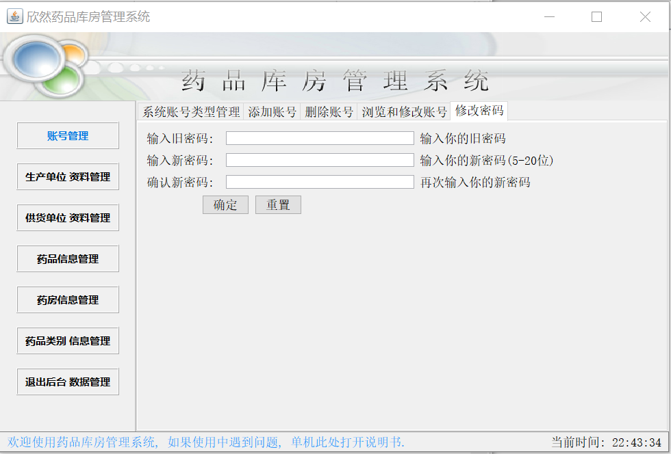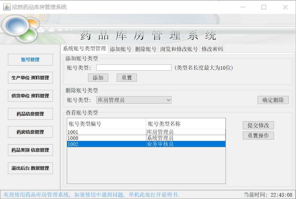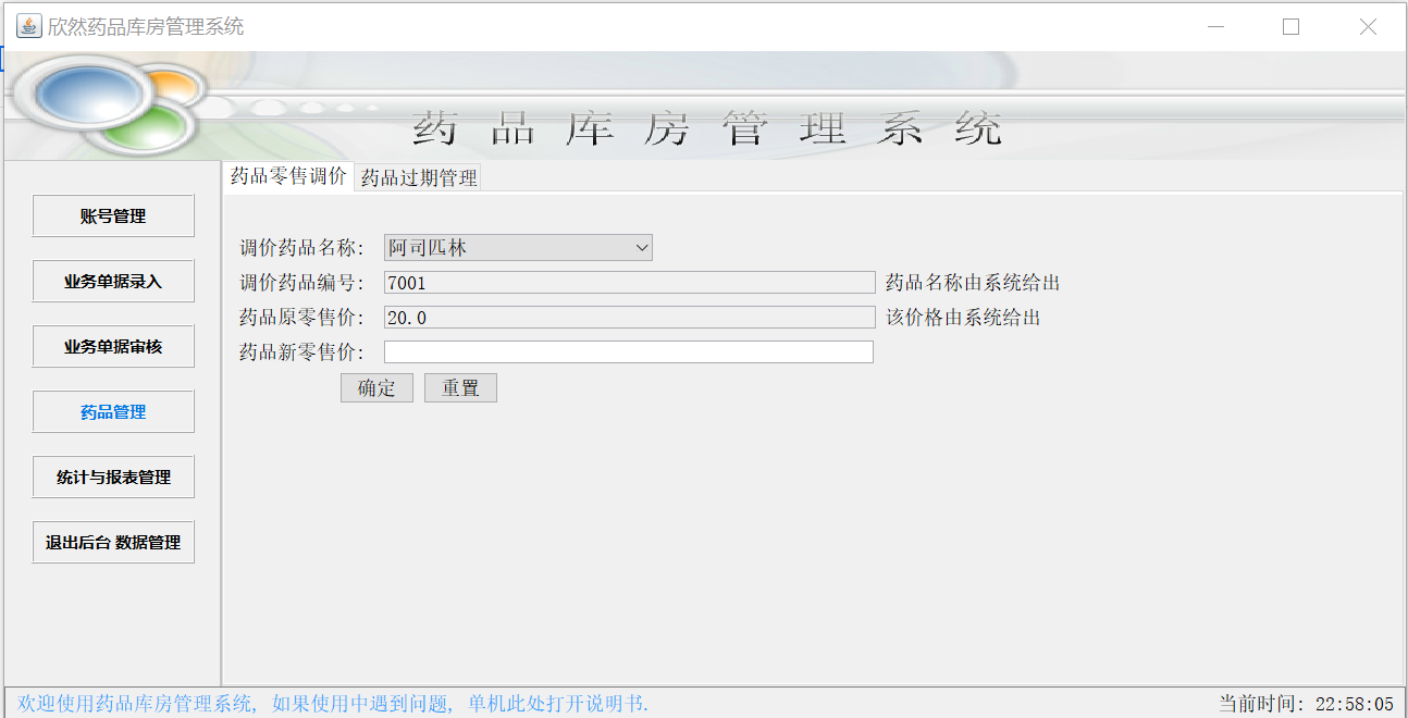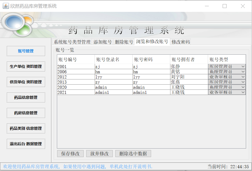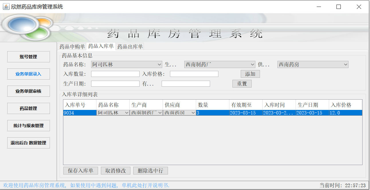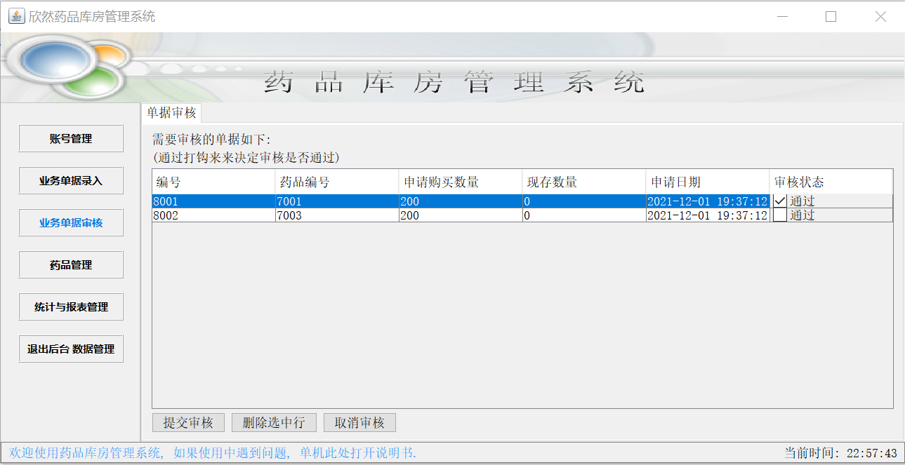 (3)业务审核员:修改密码、业务单据录入、业务单据审核、药品管理、统计与报表管理