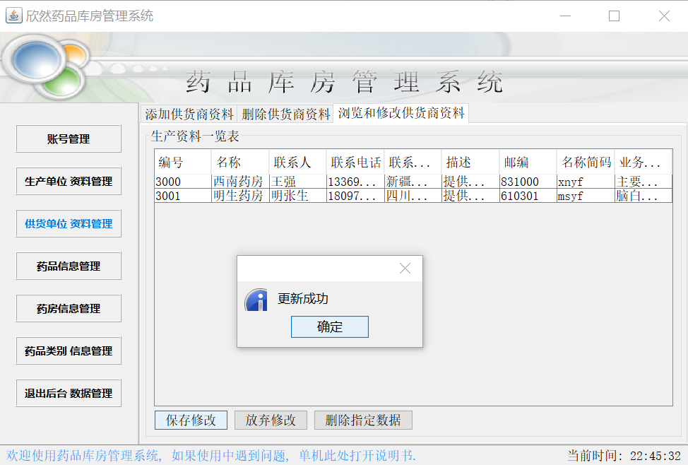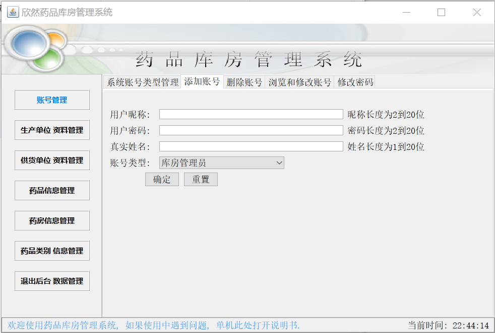 (2)库房管理员:拥有系统中所有功能。功能包括:账号管理、生产单位资料管理、供货商管理、药品信息管理、药房信息管理、药品类别管理。