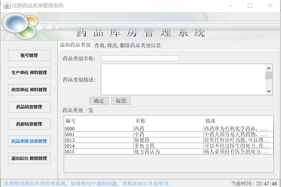 (1) 系统管理员:拥有系统中所有功能.功能包括:账号管理、生产单位资料管理、供货商管理、药品信息管理、药房信息管理、药品类别管理。