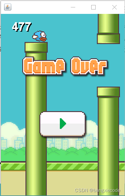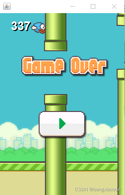 1.绘制面板,放入背景图。 2.设计地面、柱子类完成移动的效果(移动方法实现)。 3.设计小鸟,完成飞行轨迹、与柱子是否碰撞的方法等。 4.设计游戏类,完成游戏类界面的绘制。 5.设计游戏开始的方法与流程。 6.增加鼠标监听器完成对小鸟飞行及游戏运行的控制。