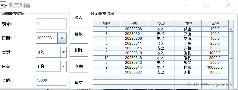 2 记账模块:对日常信息进行记录。记录信息包括:编号、日期、编号类型、内容、金额。可以对记账信息进行日常的维护操作,包括增加,删除,修改等操作