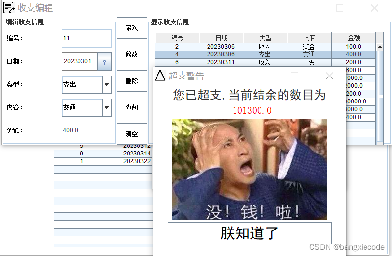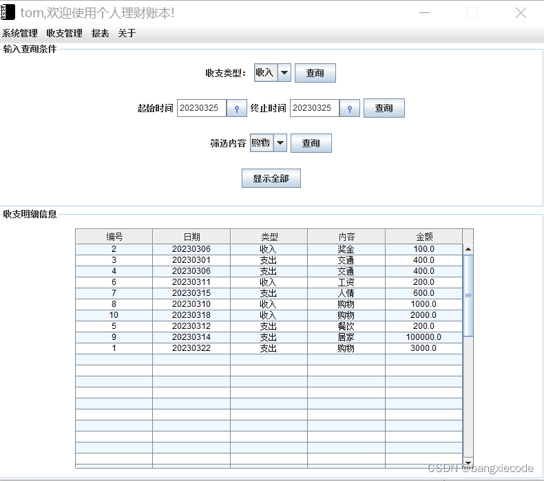 今天为大家分享一个java语言编写的个人记账系统程序-413,目前系统功能已经很全面,后续会进一步完善。整个系统界面漂亮,有完整得源码,希望大家可以喜欢。喜欢的帮忙点赞和关注。一起编程、一起进步。
