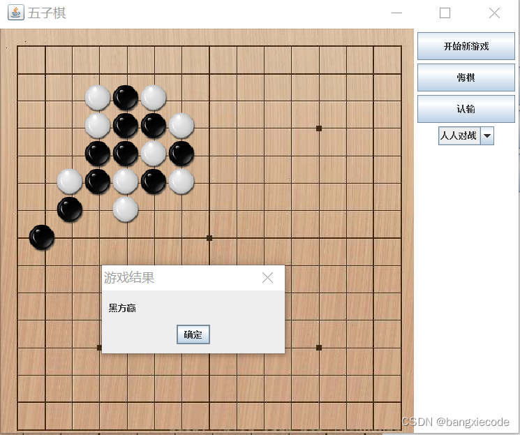 人人对战:人与人对战,轮流下棋,当一方出现五子连珠的时候,系统提示对应的方获胜。