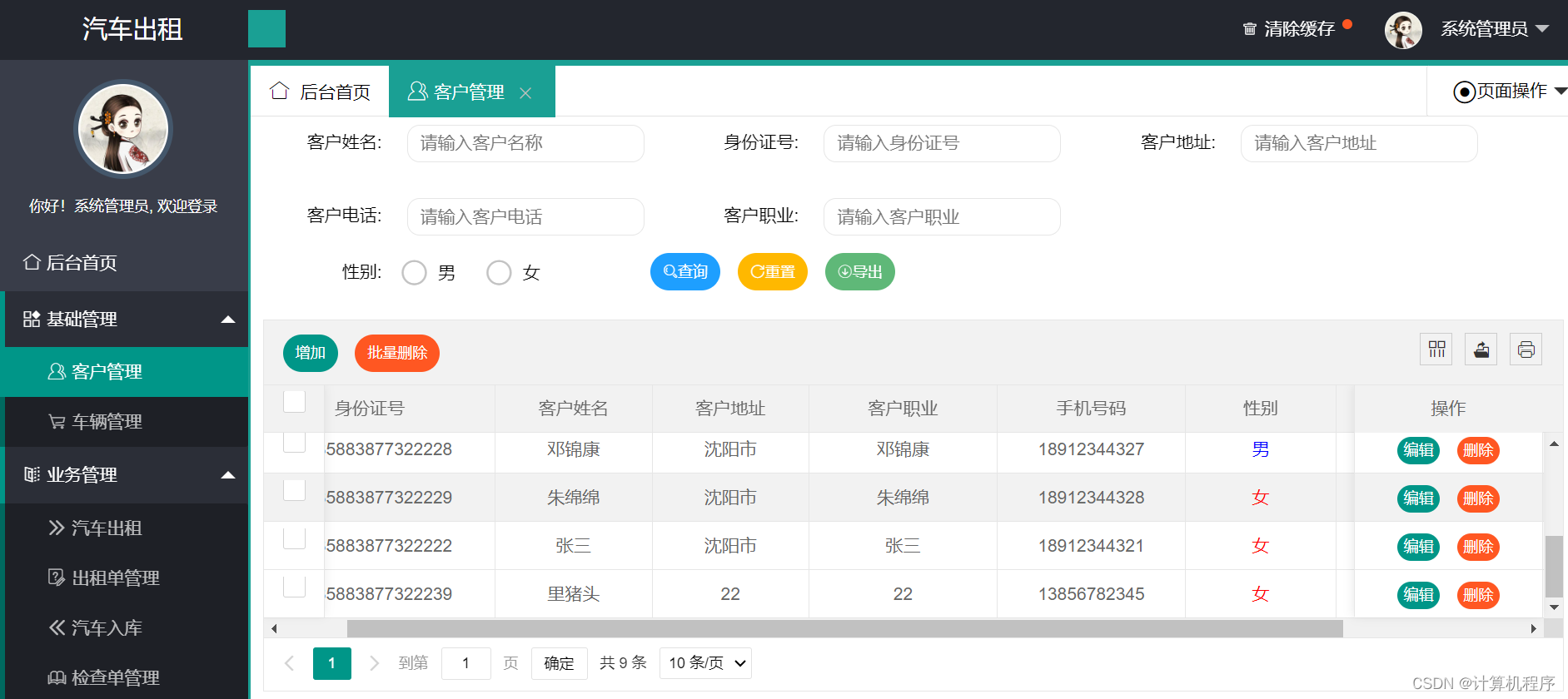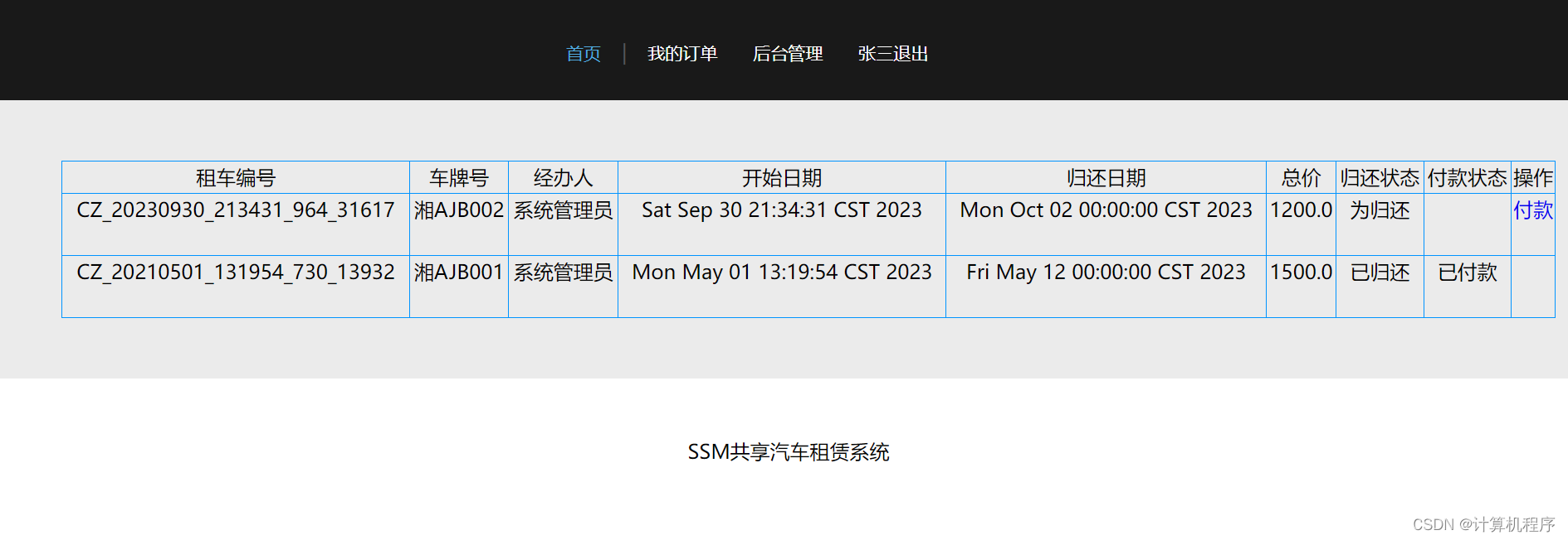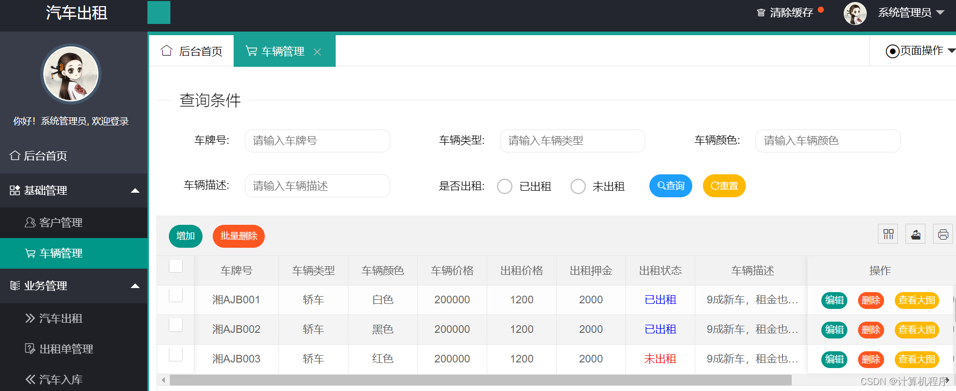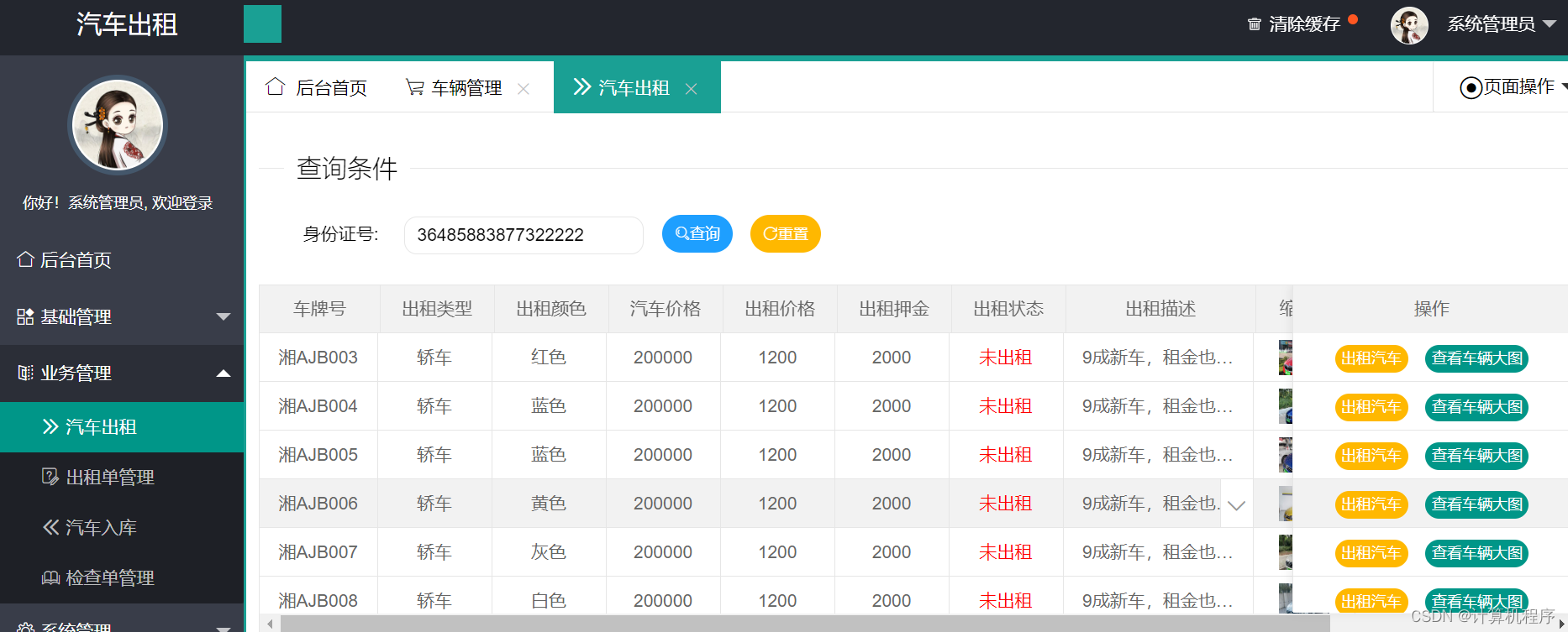 时间过来的真快,不知不觉已经来到了2024年4月份了,很长时间没有更新博客信息。四月也是一个适合回忆和感慨的月份。在这个季节里,人们会回想起过去的美好时光,也会思考未来的方向和计划。这种思考让人更加珍惜现在的生活,也让人对未来充满了信心和期待。今天继续为为大家介绍一个中等难度的web项目---在线租车系统,系统采用ssm架构,数据库为MySQL,前端视图采用的为LayUI。整个系统分为普通用户、工作人员、系统管理员三类用户。 系统管理员的功能包括:客户管理、汽车管理、权限管理;工作人员的功能包括:出租单查询、汽车出租、汽车归化检查、打印单据。普通用户的功能包括:注册、登陆、汽车查询、查看租车订单、沙箱支付等。整个系统界面漂亮,合适做毕业设计和自主学习,整个系统有完整得源码,希望大家可以喜欢。喜欢的帮忙点赞和关注。一起编程、一起进步。