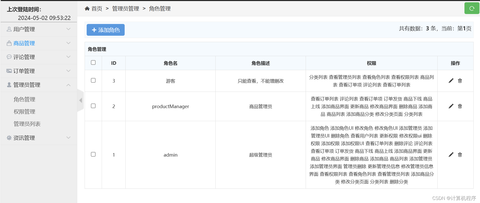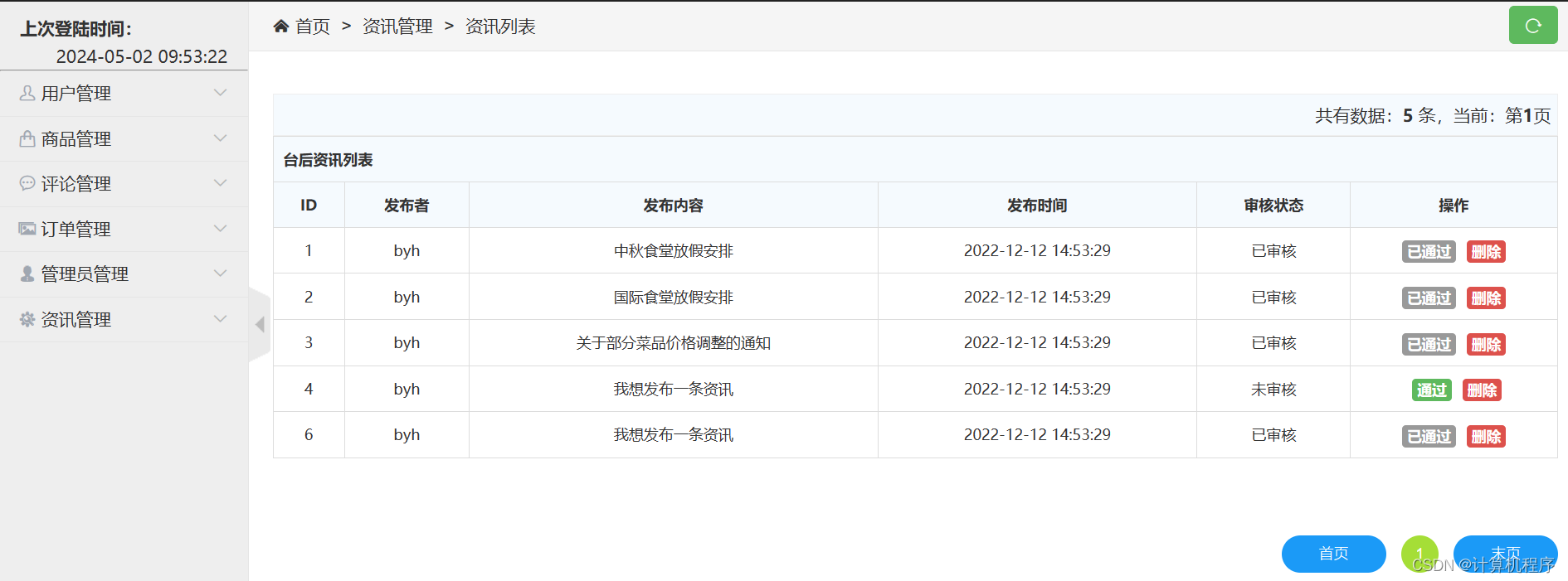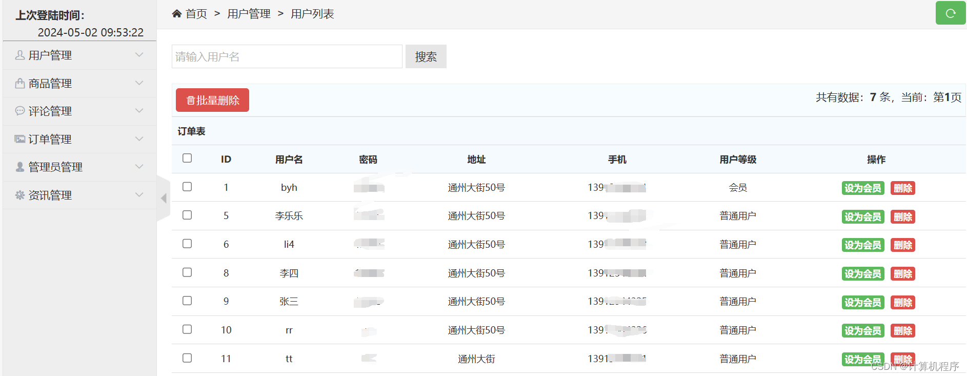 时间过来的真快,不知不觉已经来到了2024年5月份了,有两周时间没有更新博客信息。随着春天的深入,5月的天气逐渐变暖,不再像初春那样寒冷。这种温暖的气候让人感到舒适,也更容易激发人们外出活动的欲望。今天是五一放假的第一天,继续为为大家介绍合适用来做毕业设计的::在线订餐系统(506)。在线点餐系统分两类用户:普通用户和系统管理员。普通用户具备的主要功能包括:登陆、注册、浏览美食、购买、生成订单、修改个人信息、评价;系统管理员具备的功能包括:登陆、用户管理、分类管理、菜品管理、订单管理,评价管理。目前系统功能已经很全面,界面也很漂亮,整个有完整得源码,可以直接用来做毕业设计、希望大家可以喜欢。喜欢的帮忙点赞和关注。一起编程、一起进步。