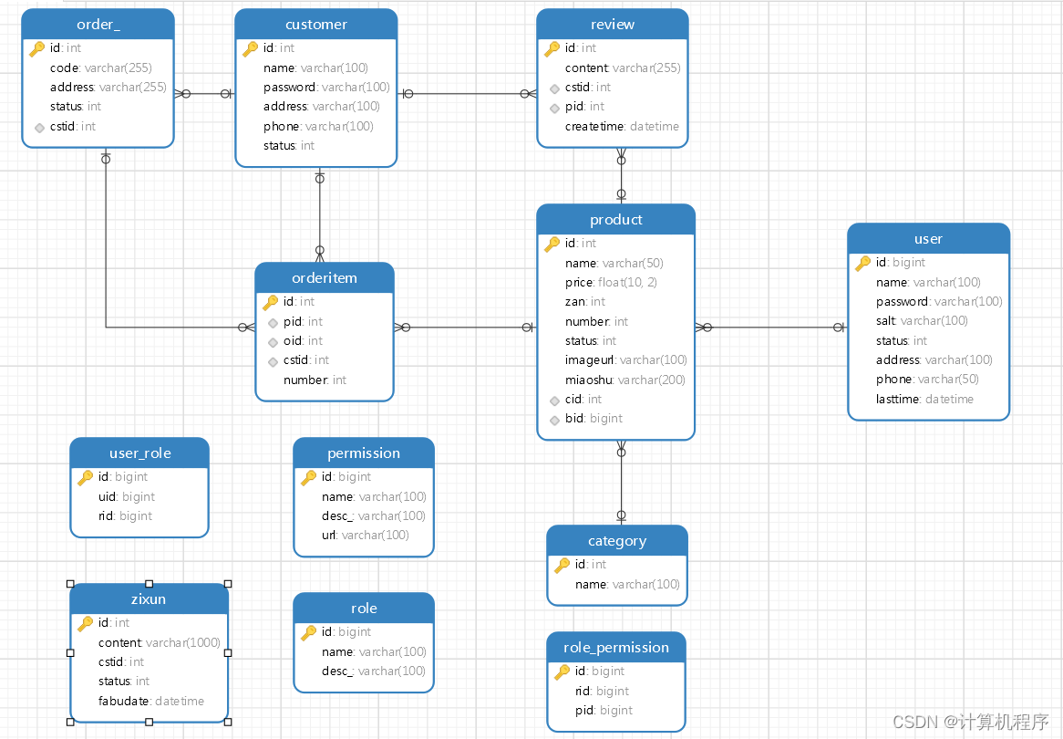本次项目和毕业设计的复杂程度左右,系统涉及到12个表,他们分别是order、customer、review、orderitem、product、user、user_role、category、permission、zixun、role、role_2_permission,他们的关联关系如下: