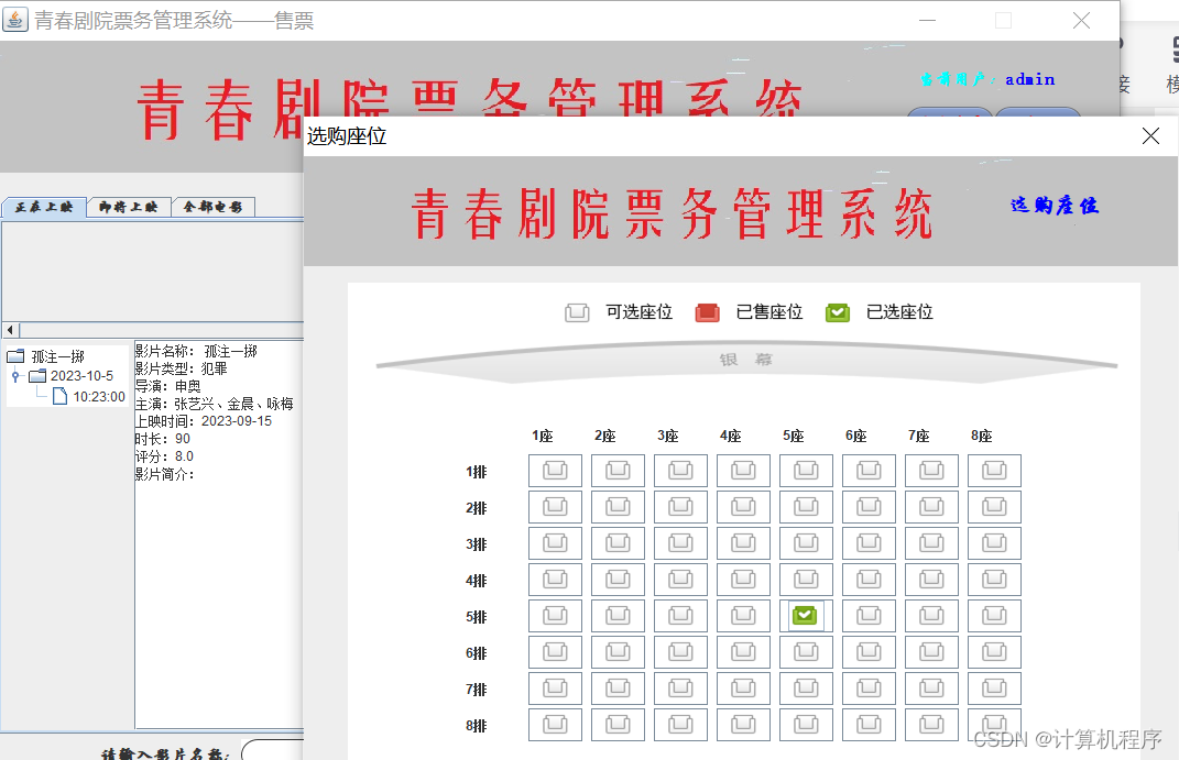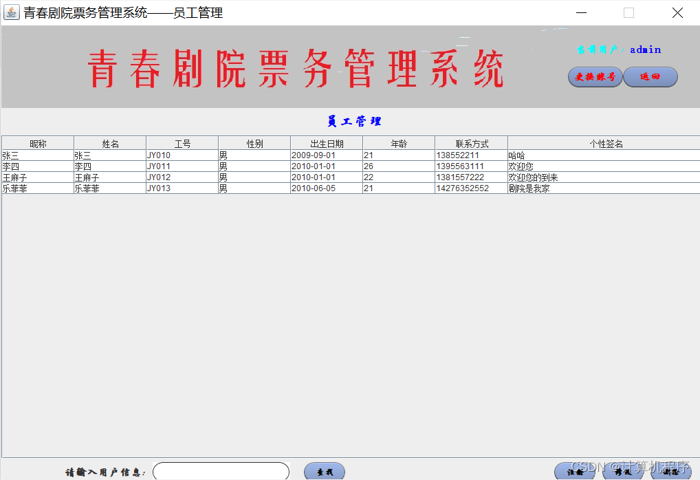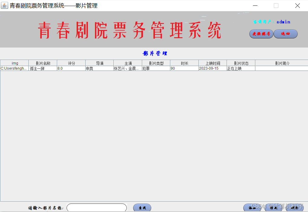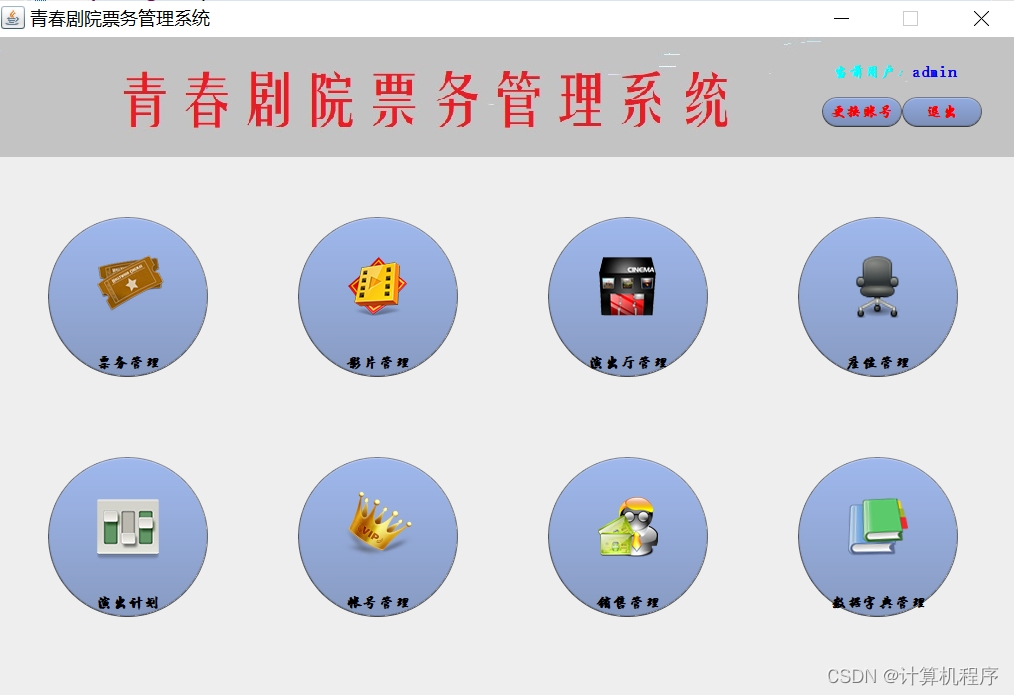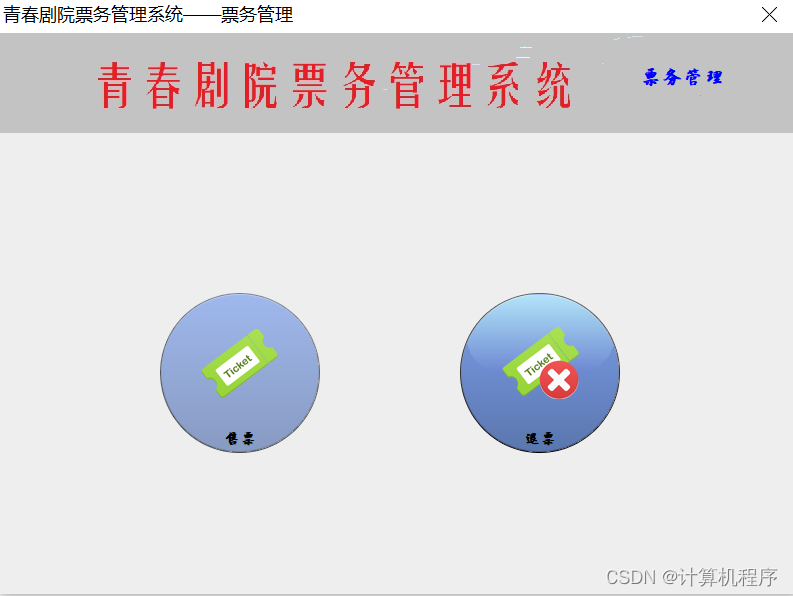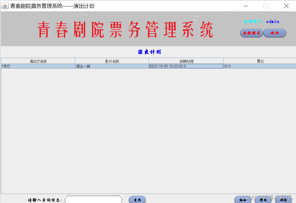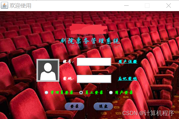 前段时间因为各种各样的事情太忙,优快云博客停止有很长一段时间了。今天为大家分享一个JAVA窗体版本的剧院票务管理系统458.目前基于Swing的窗体程序使用越来越少。但是通过窗体程序涉及到的技术在各种应用程序中都有广泛的应用。本次介绍剧院票务管理还是做的非常好,项目涉及到数据库技术、UI技术、多线程技术等,是一个实战性很强的项目。剧院票务管理分为普通用户、员工、系统管理员三个角色。普通用户的的功能包括:注册、登陆、购票、退票。员工的功能包括:登陆、影片管理、演出厅管理、演出计划管理、销售统计分析、售票、退票。系统管理员的功能包括:影片管理、演出厅管理、演出计划管理、销售统计分析、员工管理。整个项目有完整得源码,希望大家可以喜欢。通过实战项目,喜欢上编程,提高编程水平,一起加油!