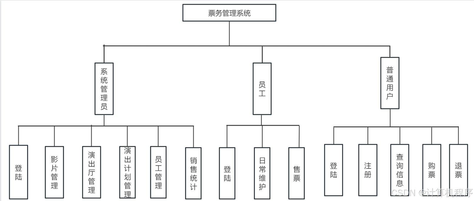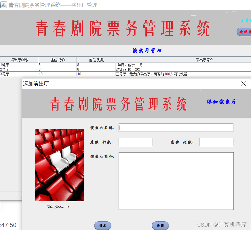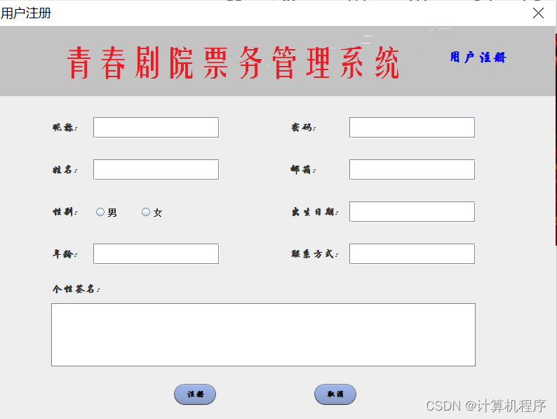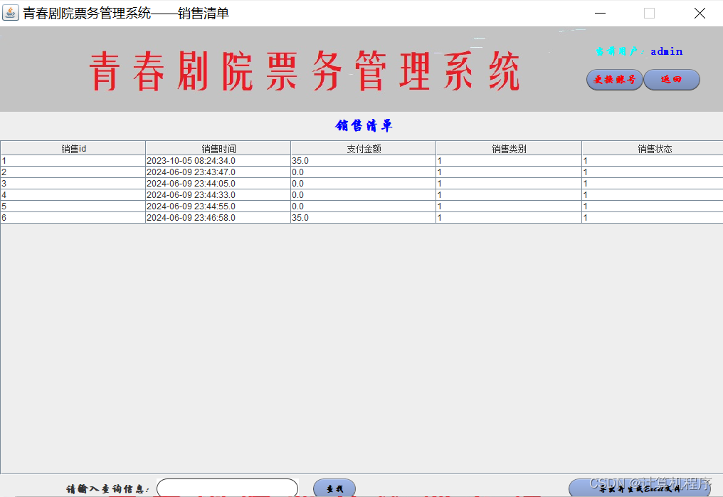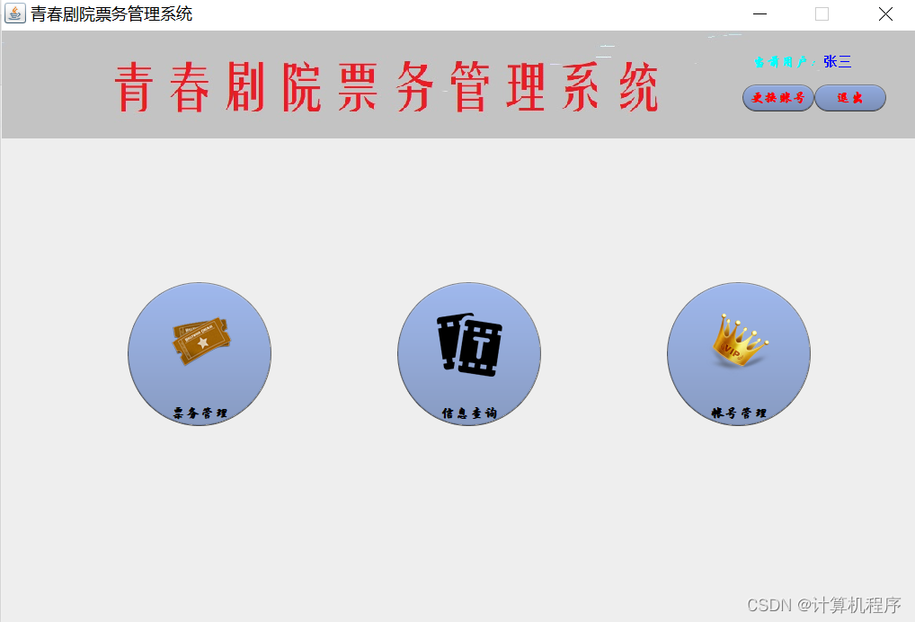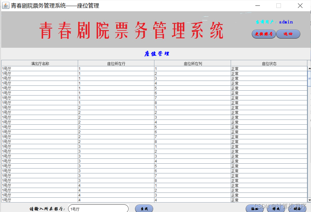 前段时间因为各种各样的事情太忙,优快云博客停止有很长一段时间了。今天为大家分享一个JAVA窗体版本的剧院票务管理系统458.目前基于Swing的窗体程序使用越来越少。但是通过窗体程序涉及到的技术在各种应用程序中都有广泛的应用。本次介绍剧院票务管理还是做的非常好,项目涉及到数据库技术、UI技术、多线程技术等,是一个实战性很强的项目。剧院票务管理分为普通用户、员工、系统管理员三个角色。普通用户的的功能包括:注册、登陆、购票、退票。员工的功能包括:登陆、影片管理、演出厅管理、演出计划管理、销售统计分析、售票、退票。系统管理员的功能包括:影片管理、演出厅管理、演出计划管理、销售统计分析、员工管理。整个项目有完整得源码,希望大家可以喜欢。通过实战项目,喜欢上编程,提高编程水平,一起加油!