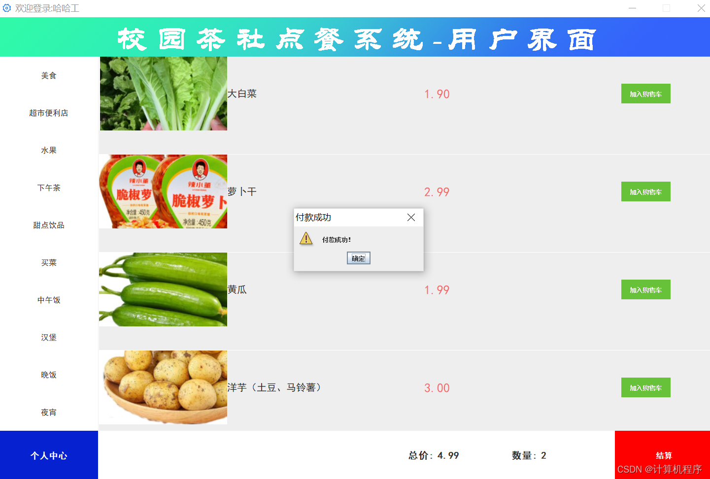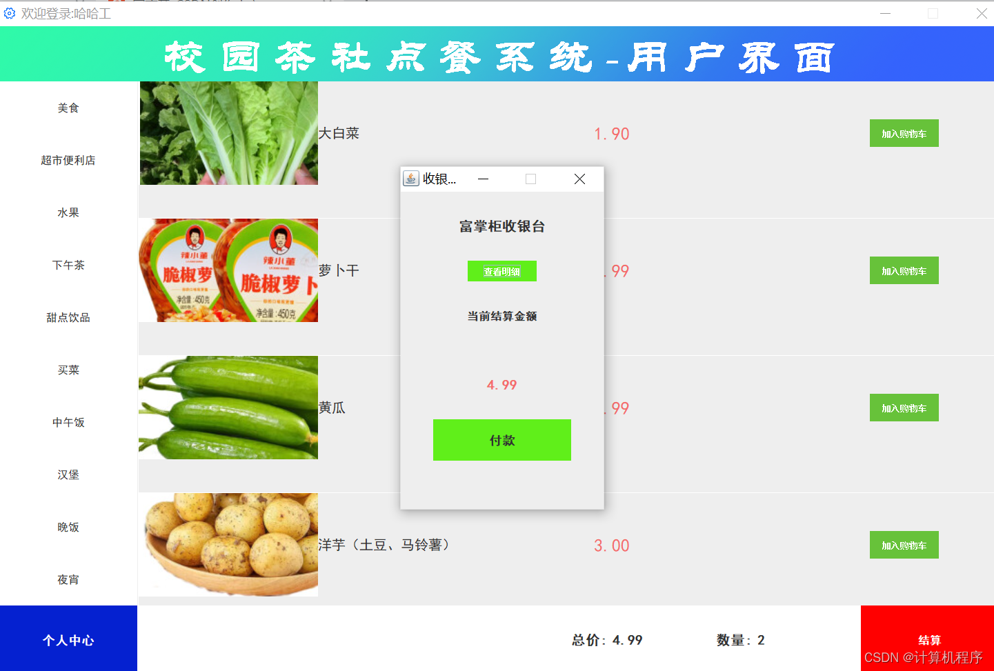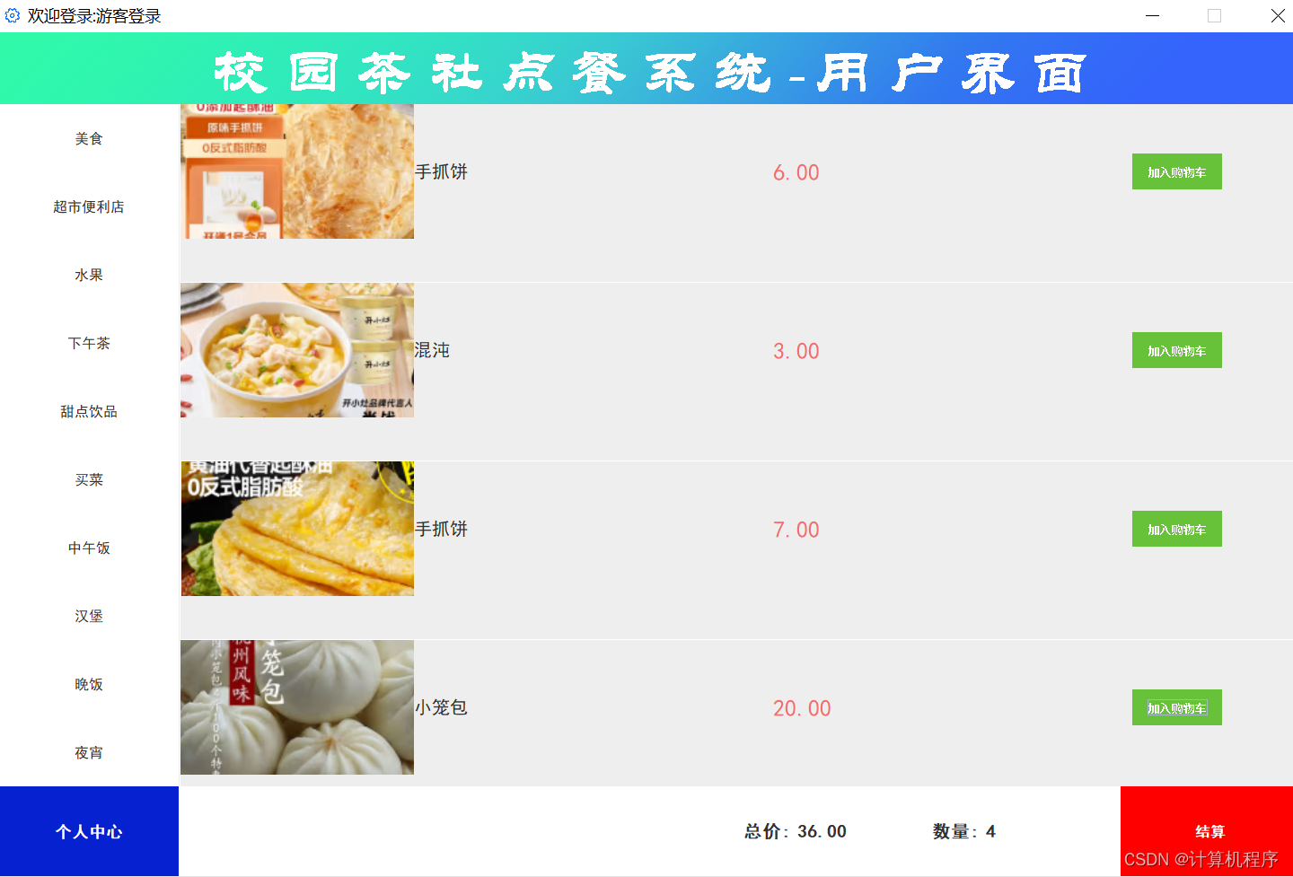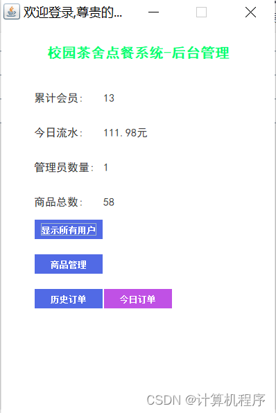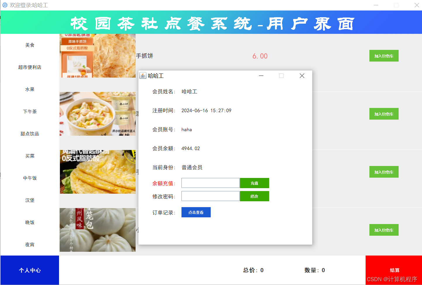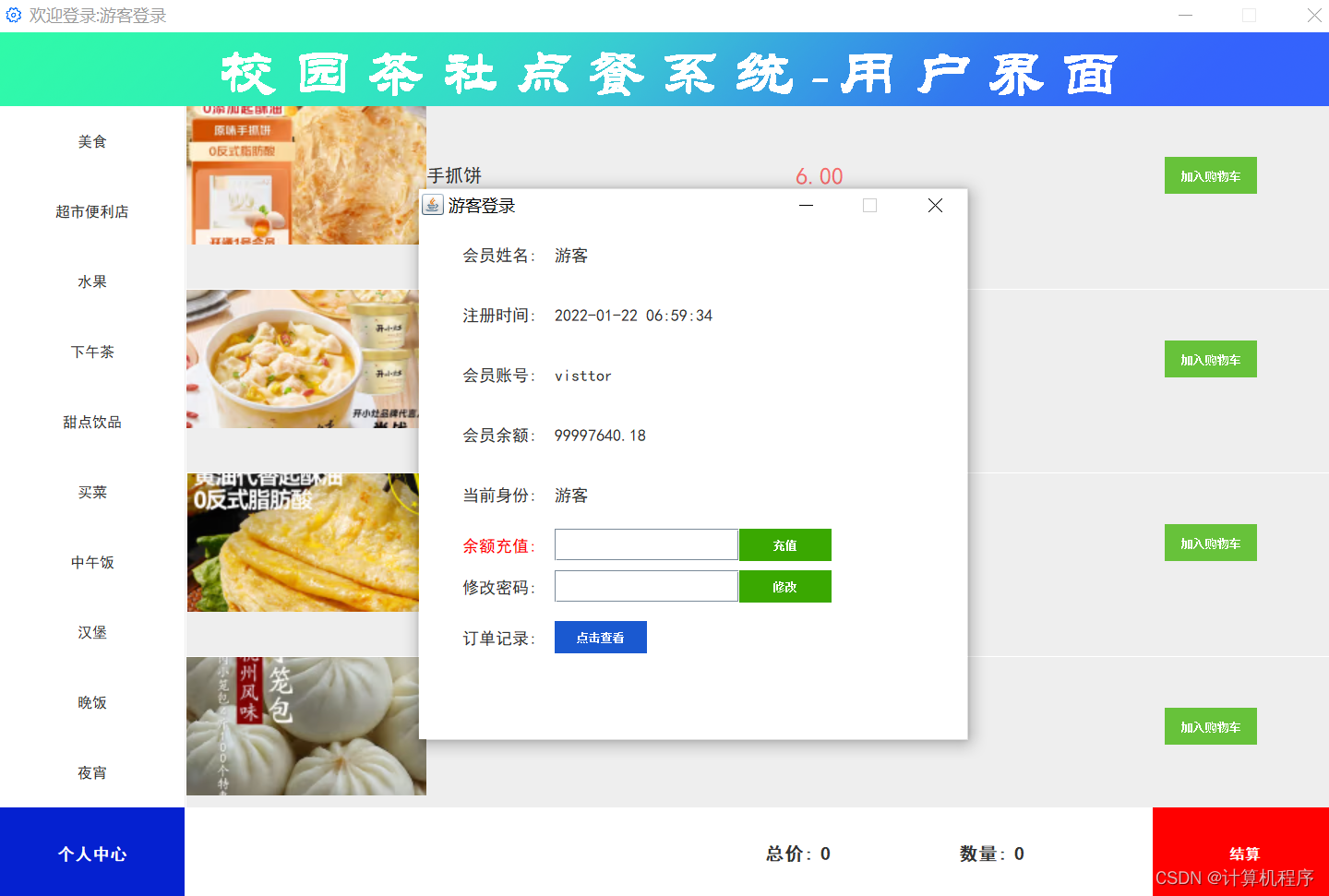 今天为大家继续介绍一个基于Java茶餐厅点餐系统(也叫餐厅点餐系统系统)476。目前基于Swing的窗体程序使用越来越少。但是通过窗体程序涉及到的技术在各种应用程序中都有广泛的应用。本次介绍餐厅点餐管理系统的涉及到数据库技术、UI技术、多线程技术、文件技术等,是一个实战性很强的项目。系统分为会员、游客、系统管理员三种用户,系统管理员具备的功能包括:登陆、主界面、用户管理、菜品管理、订单统计分析等。游客的功能模块:查看菜谱、点餐、下单、付款。会员的功能包括:登陆、查看菜谱、提交订单、在线支付、查看订单、在线充值。整个系统界面漂亮,有完整得源码,希望大家可以喜欢。通过实战项目,喜欢上编程,提高编程水平,一起加油!