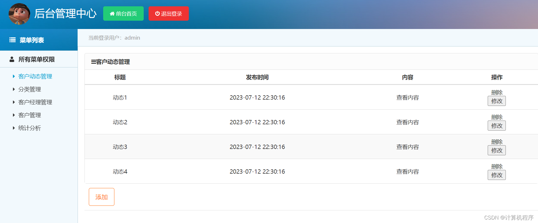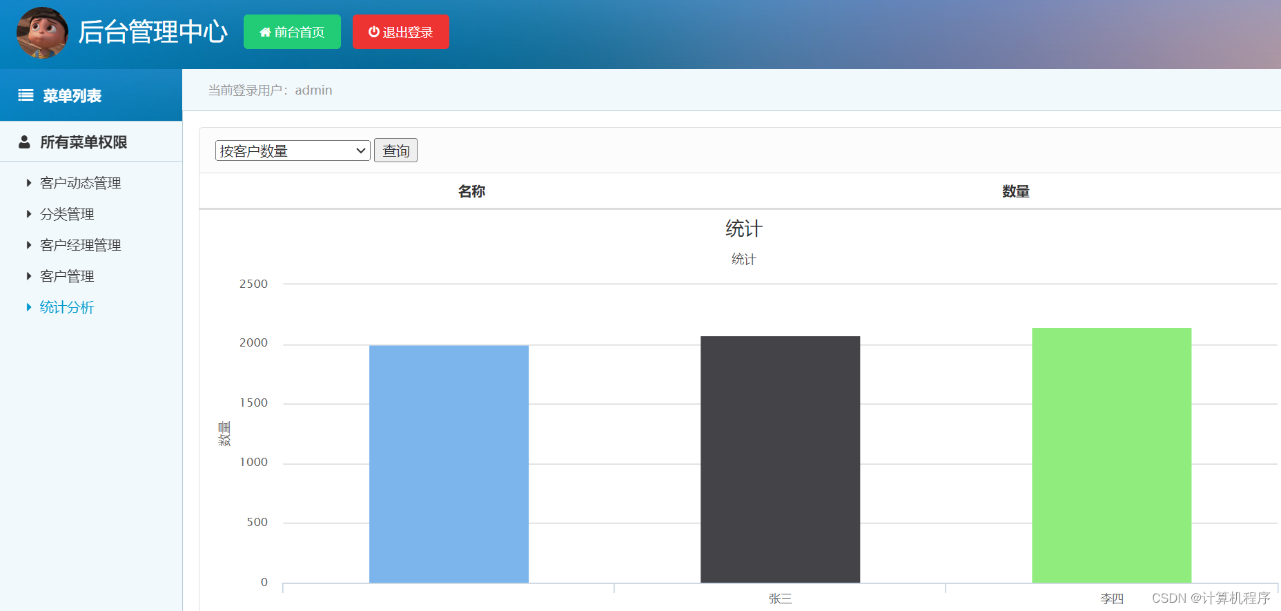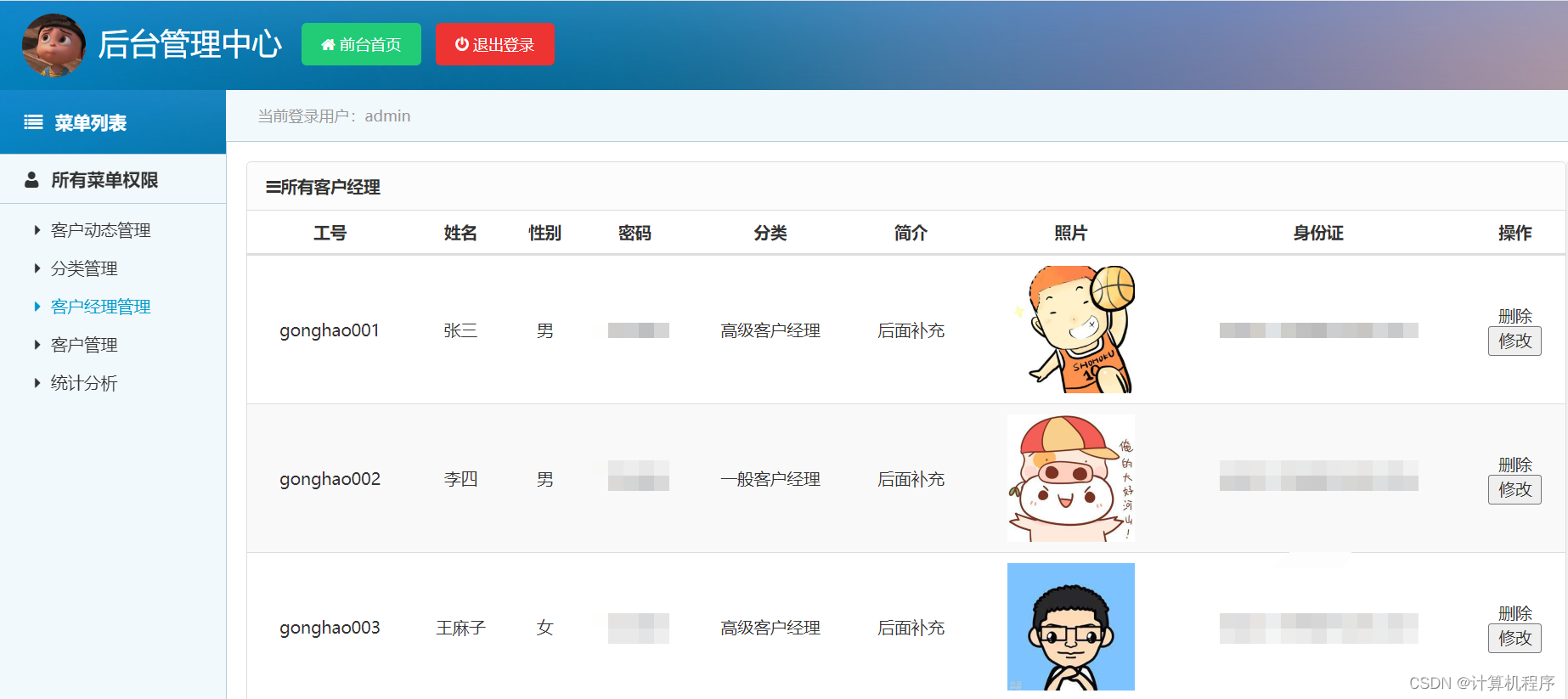 时间过来的真快,不知不觉已经来到了2024年4月份了,很长时间没有更新博客信息。四月也是一个适合回忆和感慨的月份。在这个季节里,人们会回想起过去的美好时光,也会思考未来的方向和计划。这种思考让人更加珍惜现在的生活,也让人对未来充满了信心和期待。今天继续为为大家介绍比较基础的Java web项目:客户关系管理系统,系统中拥有游客、客户经理、系统管理员三种用户。 系统管理员在系统中具有最大的权限,可以发布客户动态,对客户经理进行增删改查,对客户进行增删改查,分配客户给指定的客户经理。客户经理可以对自己的客户进行维护,包括增删改查,同时可以查看客户动态,统计客户分布情况等。游客在系统的权限最小,只能查看系统中的客户动态,其他权限,游客都不具备。目前系统功能已经比较完善,比较合适做。整个系统界面漂亮,有完整得源码,希望大家可以喜欢。喜欢的帮忙点赞和关注。一起编程、一起进步。