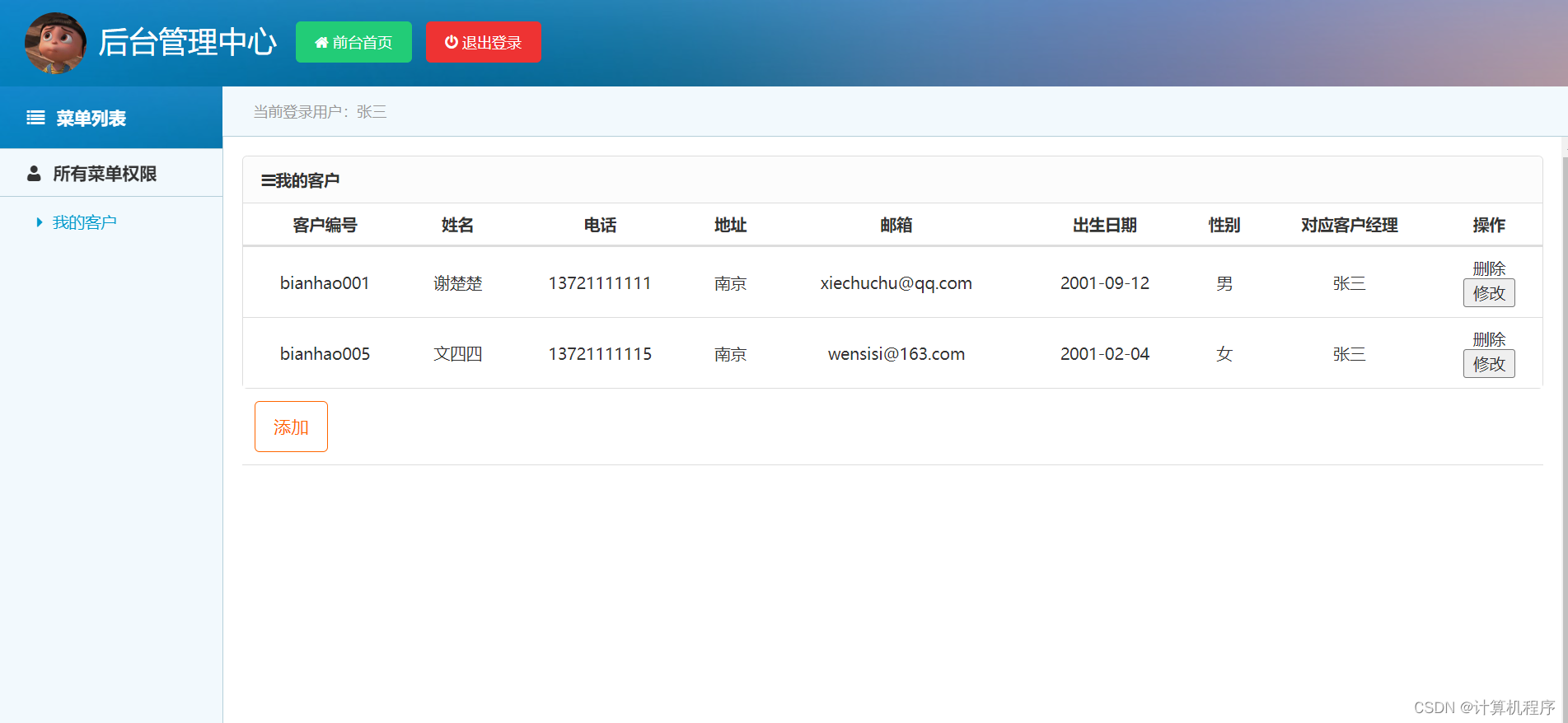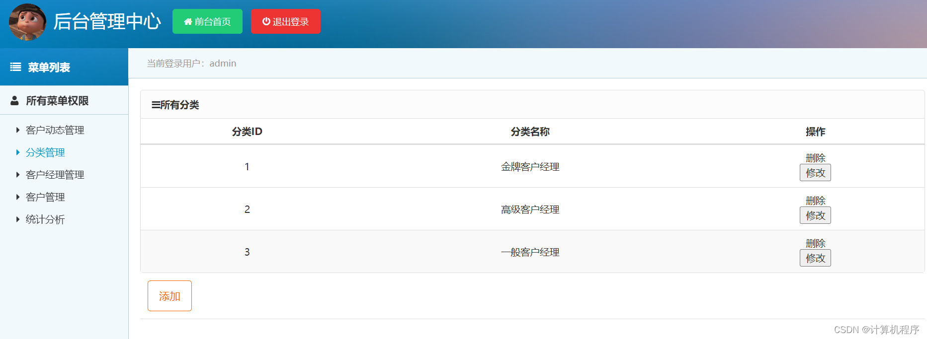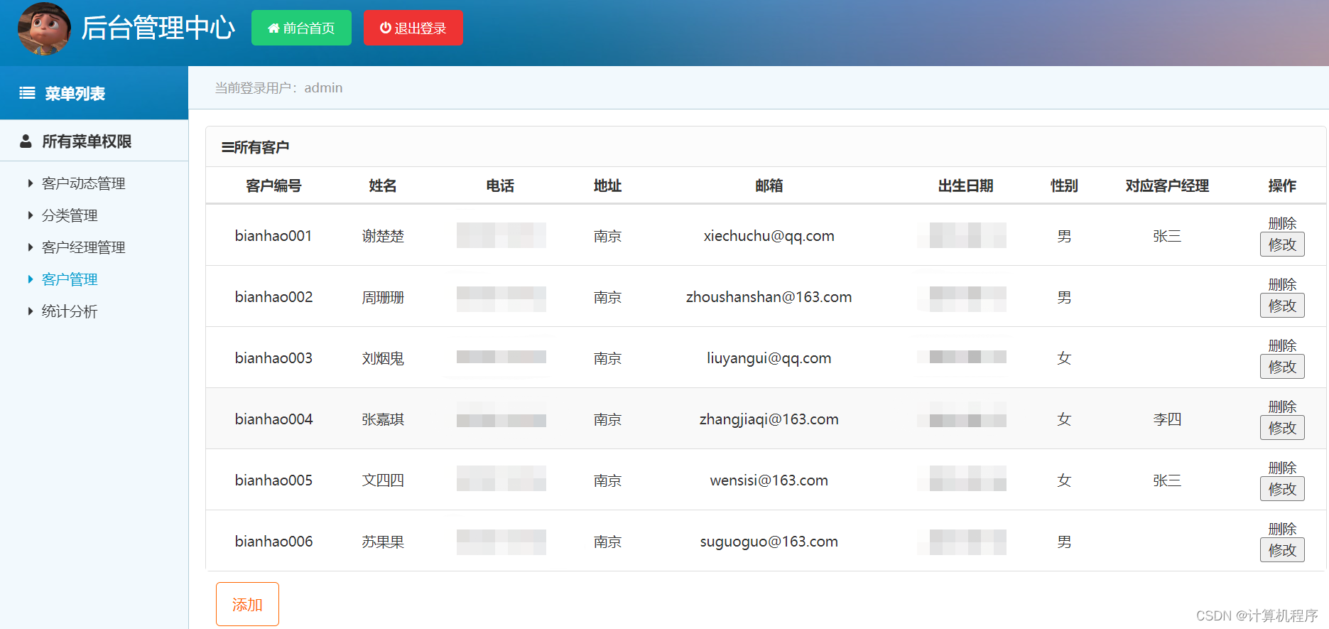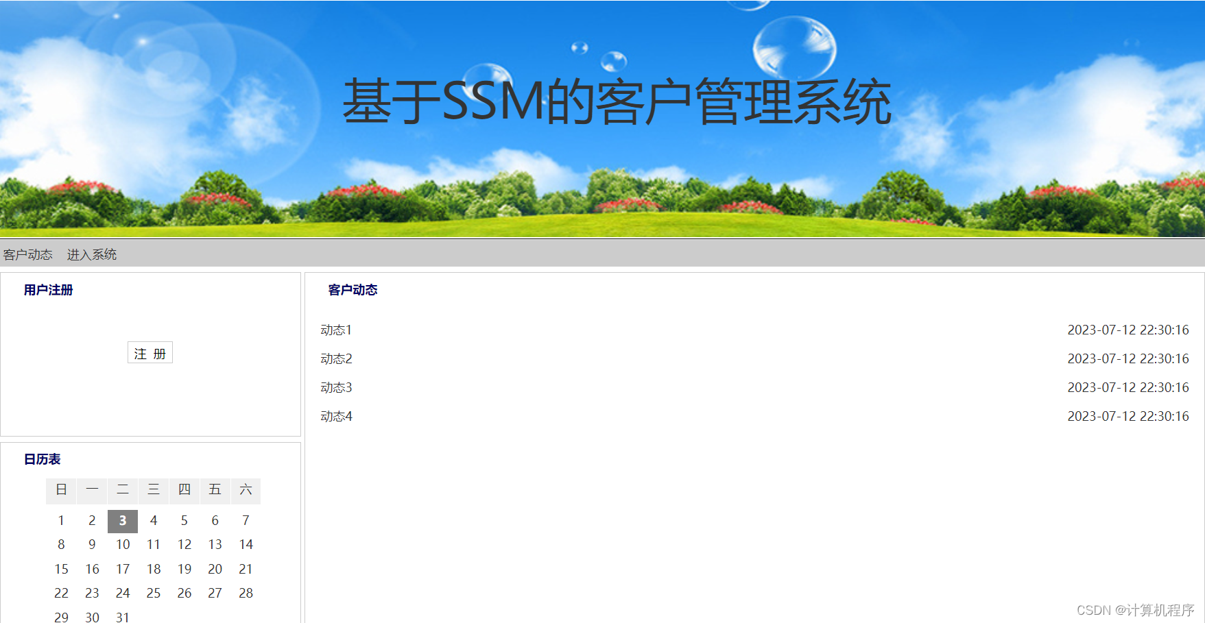 时间过来的真快,不知不觉已经来到了2024年4月份了,很长时间没有更新博客信息。四月也是一个适合回忆和感慨的月份。在这个季节里,人们会回想起过去的美好时光,也会思考未来的方向和计划。这种思考让人更加珍惜现在的生活,也让人对未来充满了信心和期待。今天继续为为大家介绍比较基础的Java web项目:客户关系管理系统,系统中拥有游客、客户经理、系统管理员三种用户。 系统管理员在系统中具有最大的权限,可以发布客户动态,对客户经理进行增删改查,对客户进行增删改查,分配客户给指定的客户经理。客户经理可以对自己的客户进行维护,包括增删改查,同时可以查看客户动态,统计客户分布情况等。游客在系统的权限最小,只能查看系统中的客户动态,其他权限,游客都不具备。目前系统功能已经比较完善,比较合适做。整个系统界面漂亮,有完整得源码,希望大家可以喜欢。喜欢的帮忙点赞和关注。一起编程、一起进步。