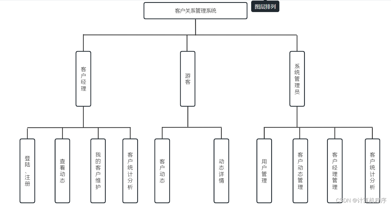 系统管理员在系统中具有最大的权限,可以发布客户动态,对客户经理进行增删改查,对客户进行增删改查,分配客户给指定的客户经理。客户经理可以对自己的客户进行维护,包括增删改查,同时可以查看客户动态,统计客户分布情况等。游客在系统的权限最小,只能查看系统中的客户动态,其他权限,游客都不具备。其中整个系统功能结构如下图所示意: