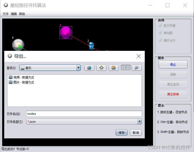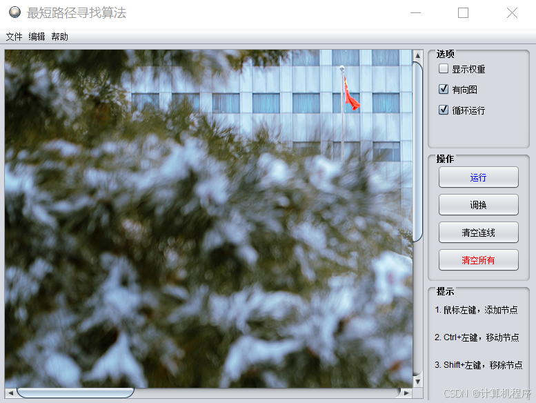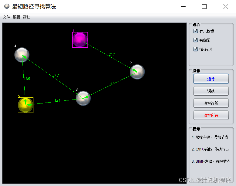 前段时间由于各种各样的事情太忙,优快云博客停止有很长一段时间了。今天为大家分享一个JAVA窗体版本的最短路径算法动态演示系统474.目前基于Swing的窗体程序使用越来越少。但是通过窗体程序涉及到的技术在各种应用程序中都有广泛的应用。本次介绍最短路径算法动态演示系统还是做的非常好,项目涉及到I/O技术、UI技术、多线程技术等,是一个实战性很强的项目。项目的主要功能包括:设置节点位置、边线权重、动态显示Dijkstra算法运行步骤和结果、导出JSON、查看使用帮助等功能。通过本系统可以非常清晰的了解Dijkstra的运算过程,对于理解算法和后续的进一步学习有非常大的帮助。整个项目有完整得源码,希望大家可以喜欢。通过实战项目,喜欢上编程,提高编程水平,一起加油!