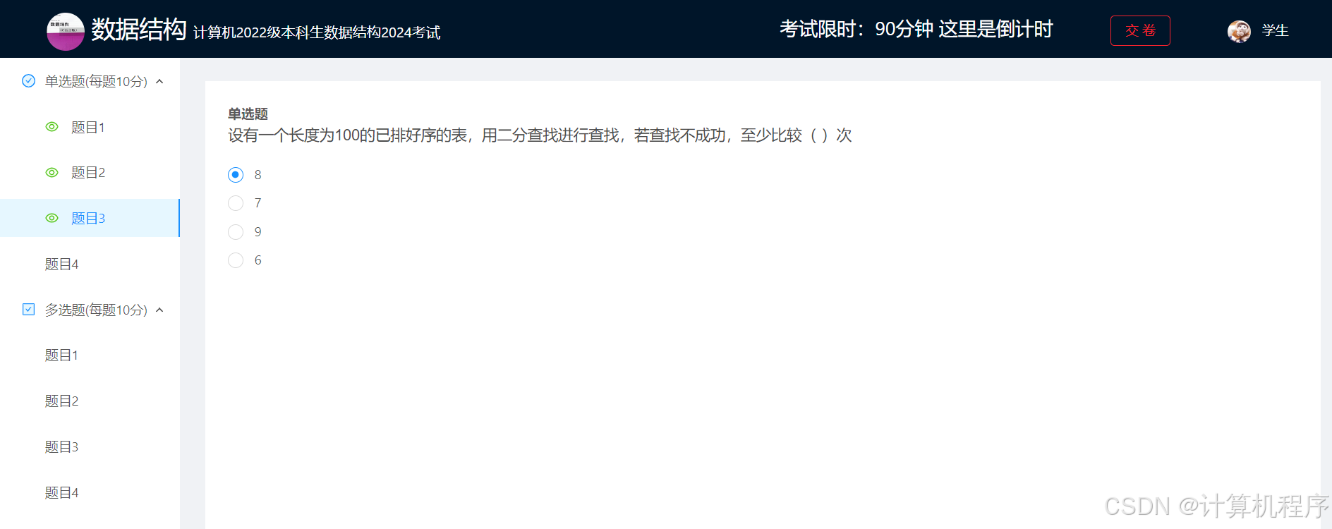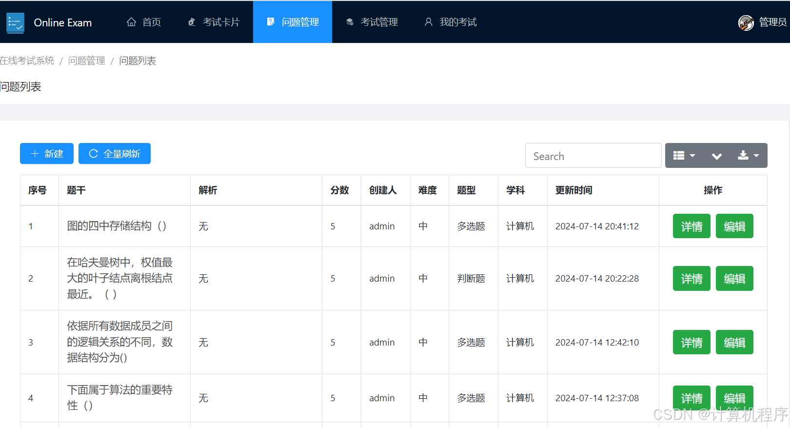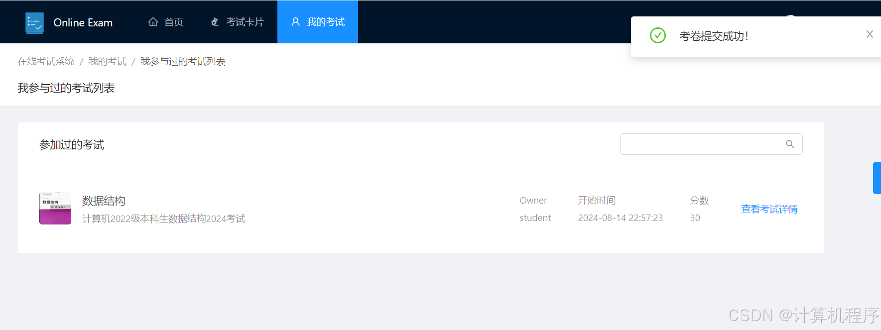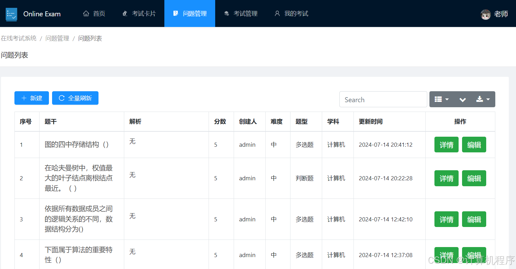 前段时间各种各样的事情太忙,优快云博客停止有很长一段时间了。今天为大家分享一个基于SpringBoot+Vue的在线考试系统514.本次介绍的SpringBoot+Vue的在线考试系统,系统开发涉及到SpringBoot技术、数据库技术、UI技术、多线程技术、web开发等、VUE技术,是一个综合性和实战性非常强的的项目。SpringBoot+Vue的在线考试系统分三种用户类型:老师、学生、系统管理员。学生的功能包括:登陆、在线考试、在线练习、查看考试结果、答题情况、个人信息修改等功能;老师的功能包括:考试管理、题库管理、学生成绩管理、考试历史记录查询;系统管理员的功能包括:登陆、考试管理、题目管理、考试历史查询、学生成绩查询。整个项目界面漂亮、功能比较完善、有完整得源码,希望大家可以喜欢。通过实战项目,喜欢上编程,提高编程水平,一起加油。