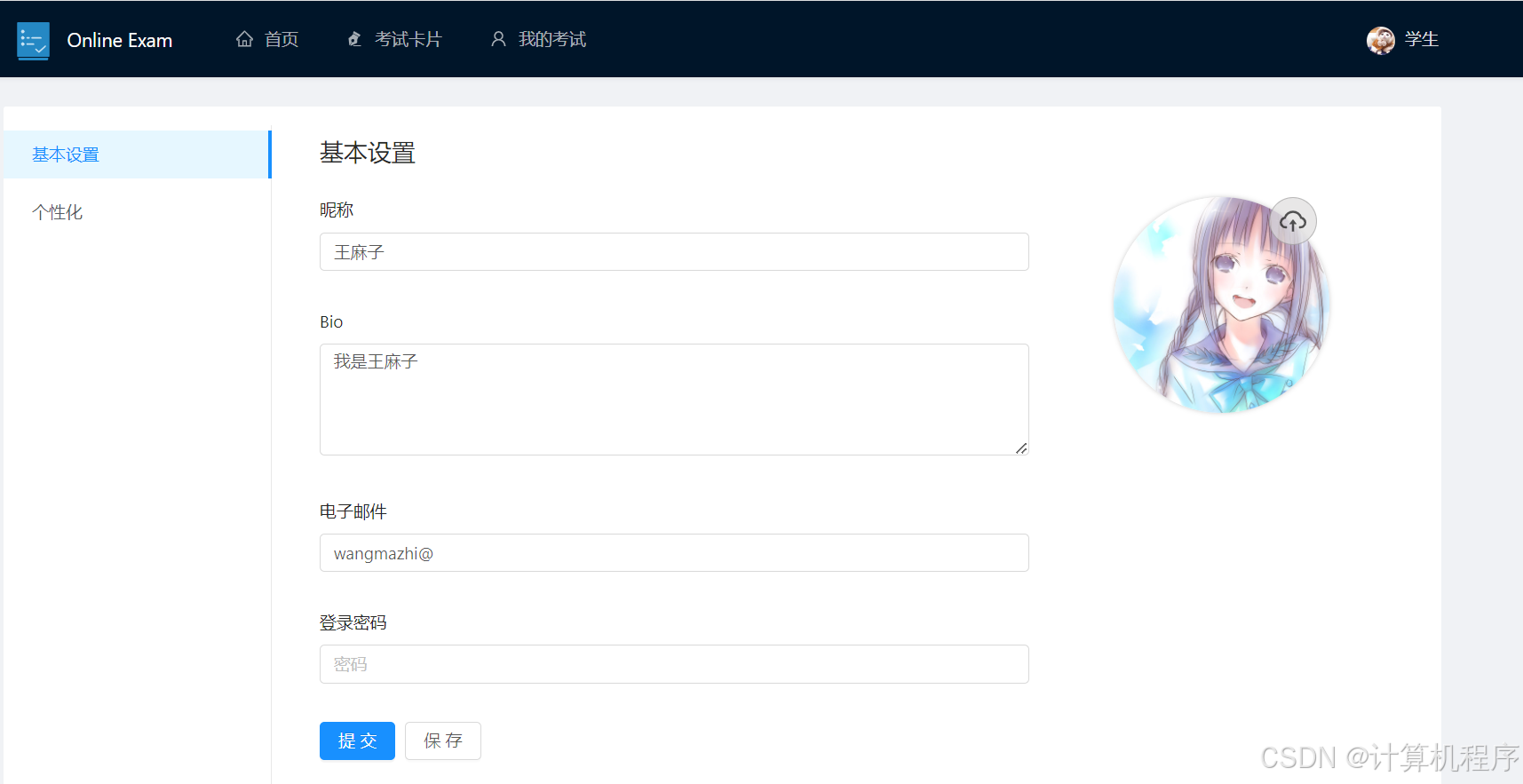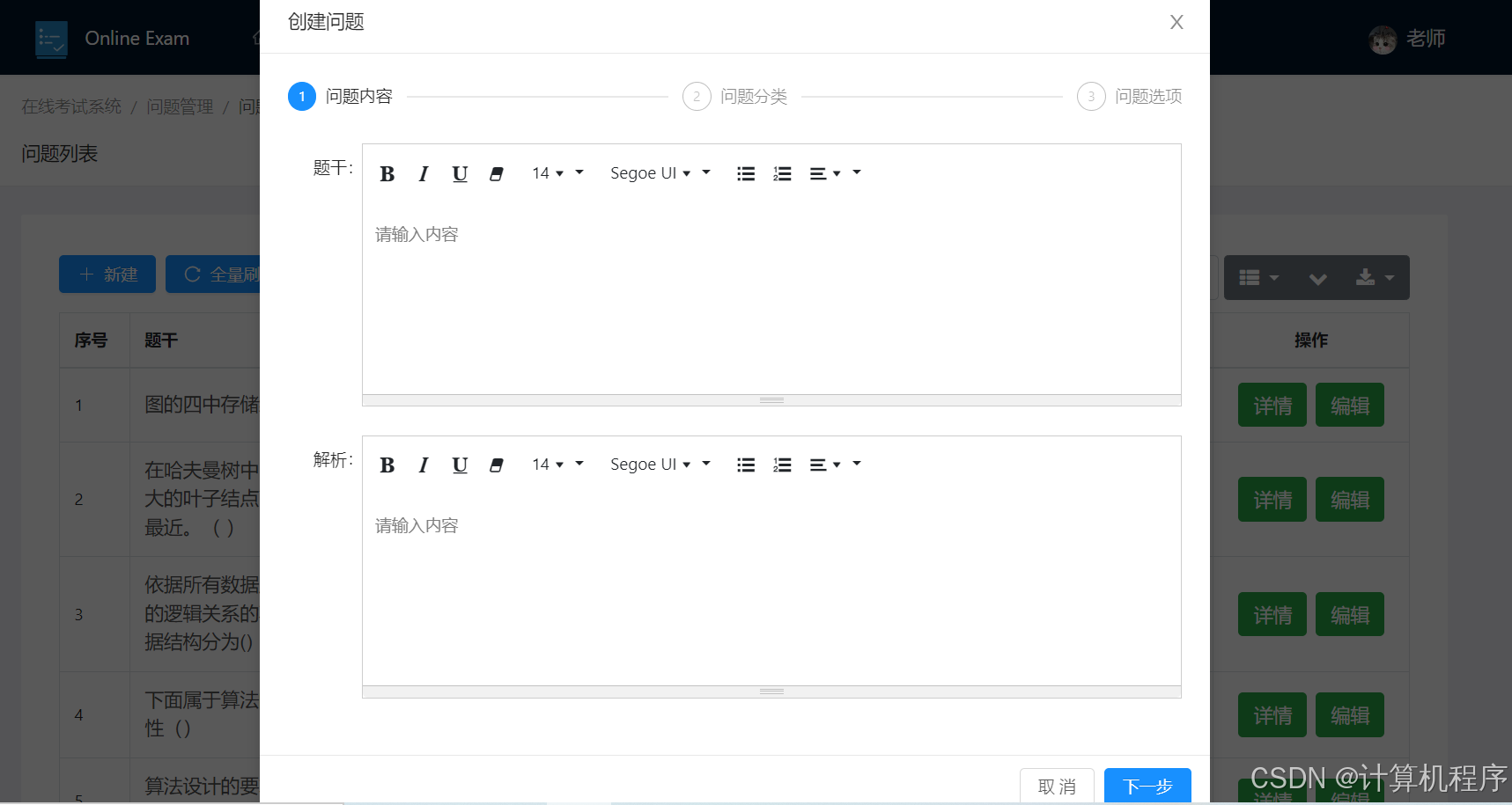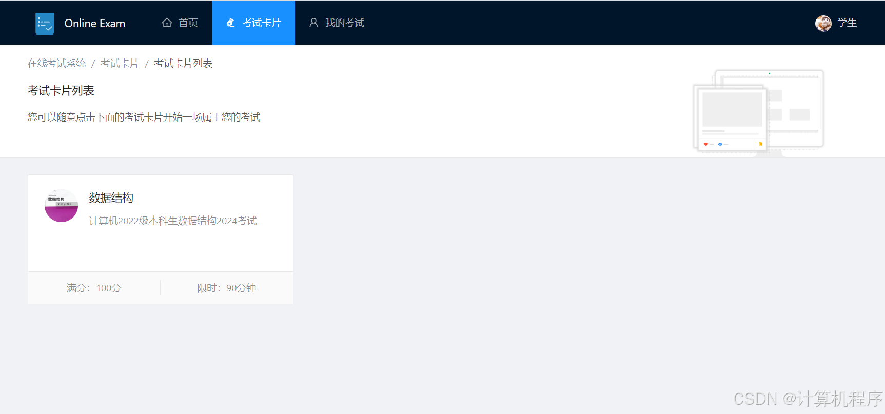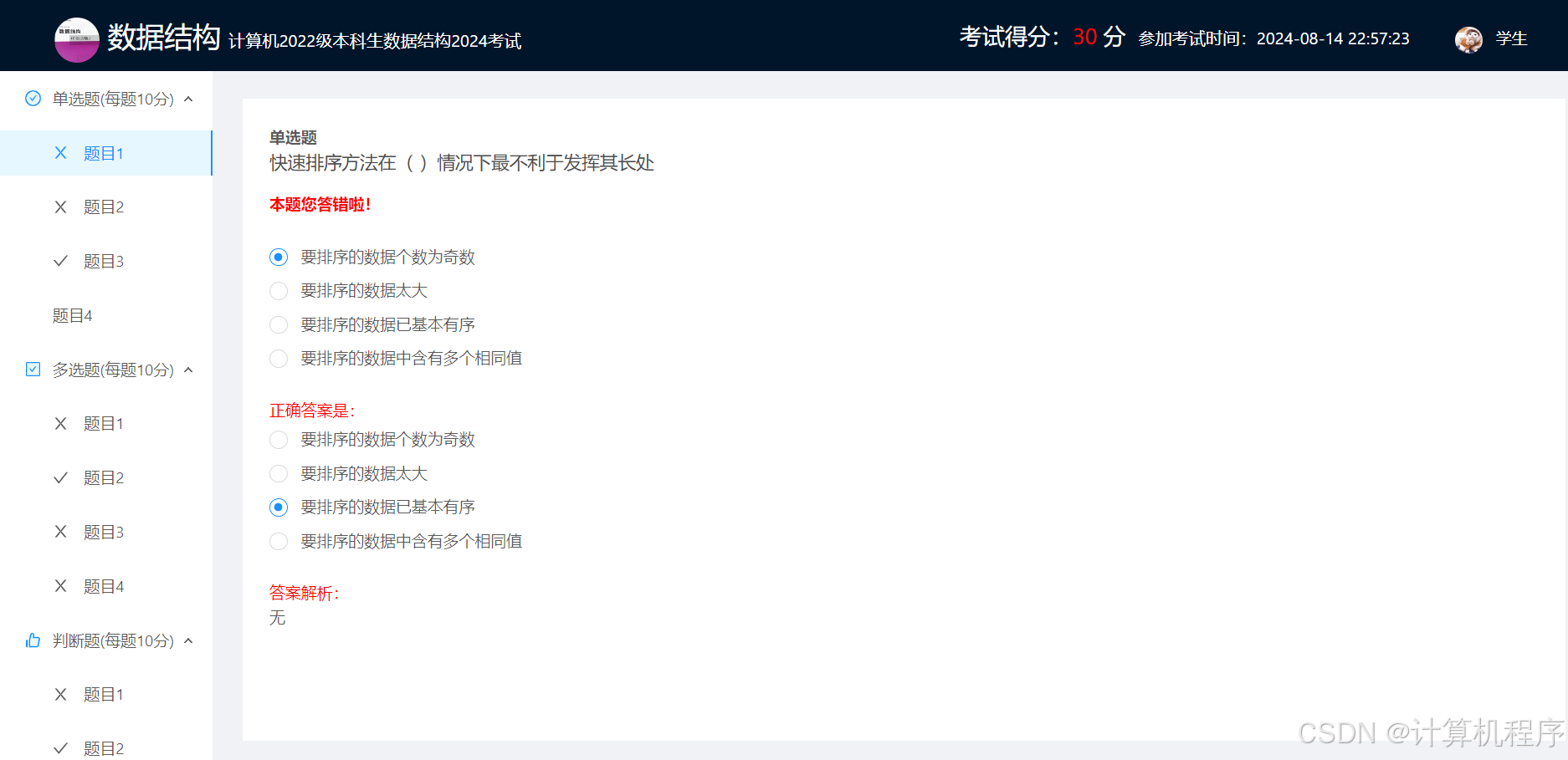 前段时间各种各样的事情太忙,优快云博客停止有很长一段时间了。今天为大家分享一个基于SpringBoot+Vue的在线考试系统514.本次介绍的SpringBoot+Vue的在线考试系统,系统开发涉及到SpringBoot技术、数据库技术、UI技术、多线程技术、web开发等、VUE技术,是一个综合性和实战性非常强的的项目。SpringBoot+Vue的在线考试系统分三种用户类型:老师、学生、系统管理员。学生的功能包括:登陆、在线考试、在线练习、查看考试结果、答题情况、个人信息修改等功能;老师的功能包括:考试管理、题库管理、学生成绩管理、考试历史记录查询;系统管理员的功能包括:登陆、考试管理、题目管理、考试历史查询、学生成绩查询。整个项目界面漂亮、功能比较完善、有完整得源码,希望大家可以喜欢。通过实战项目,喜欢上编程,提高编程水平,一起加油。