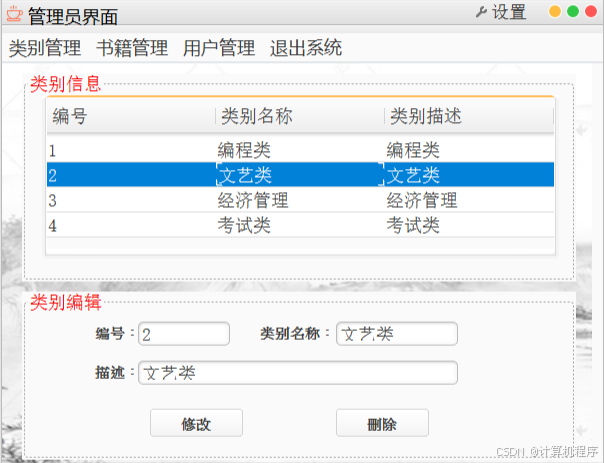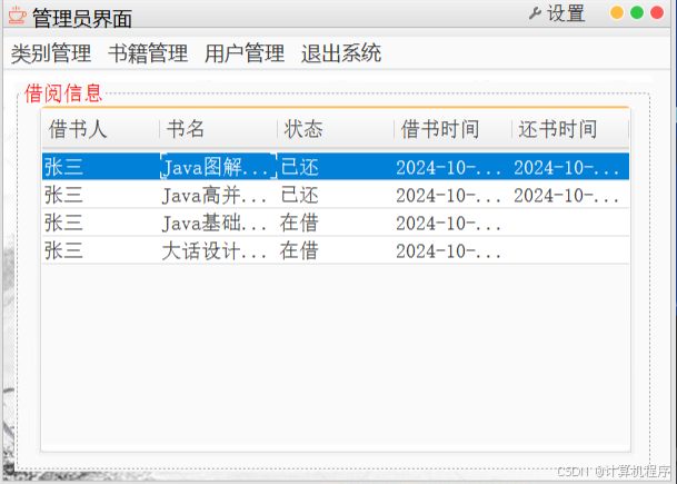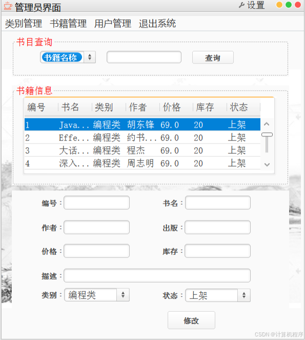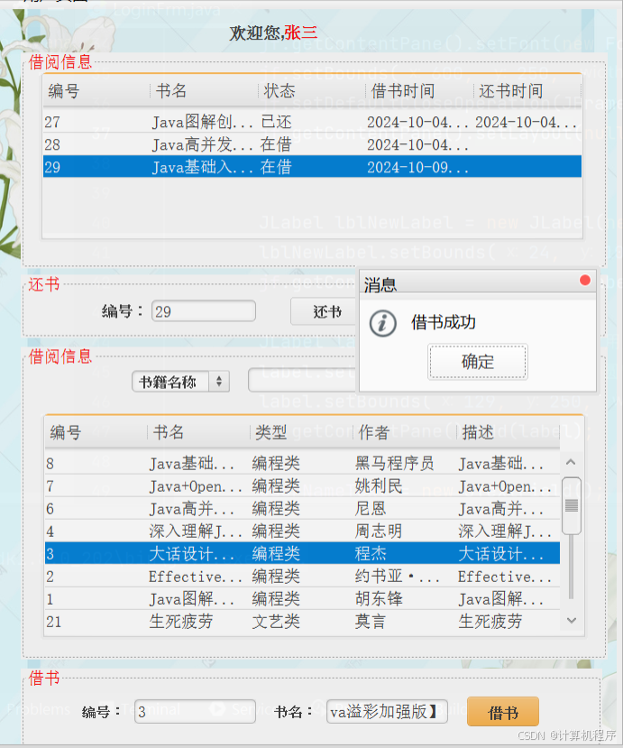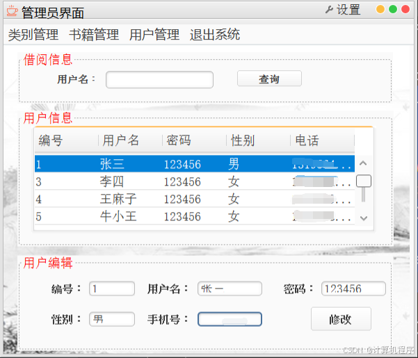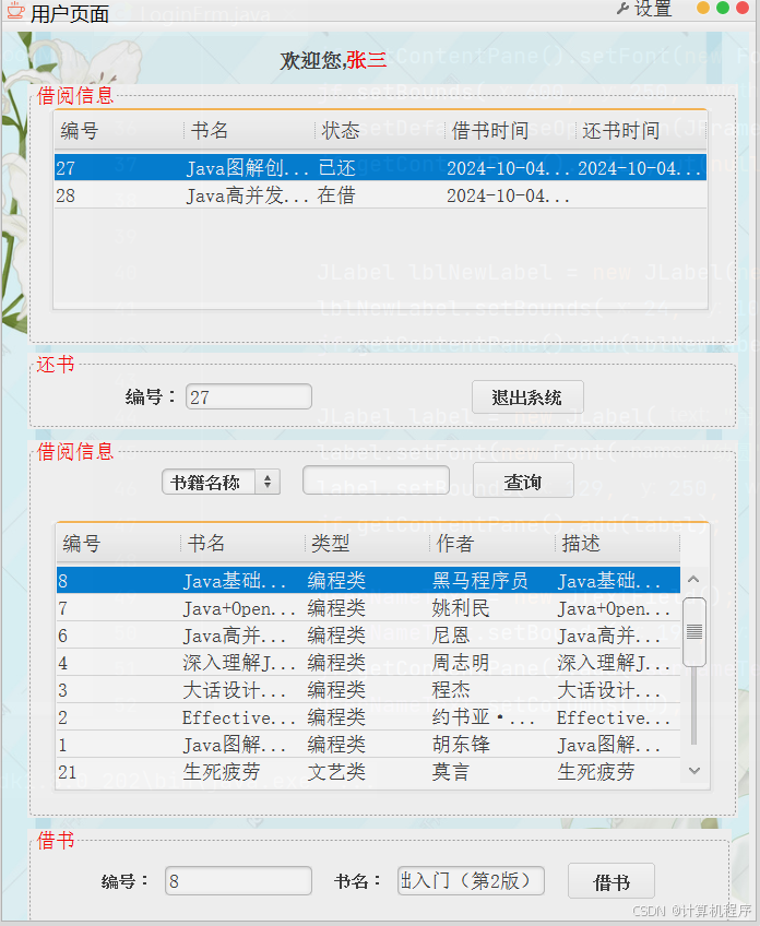 前段时间各种各样的事情太忙,优快云博客停止有很长一段时间了。今天为大家分享一个JAVA窗体版本的图书管理系统490.目前基于Swing的窗体程序使用越来越少。但是通过窗体程序涉及到的技术在各种应用程序中都有广泛的应用。本次介绍的图书管理系统涉及到数据库技术、UI技术、多线程技术等,是一个实战性很强的项目。本次介绍的图书管理系统分为系统管理员和普通用户两种用户类型。普通用户的功能包括:注册、登陆、查询图书、借阅图书、归还图书、查看借阅记录。系统管理员的功能包括:登录、用户管理、图书分类管理、图书管理、借阅管理。整个项目有完整得源码,希望大家可以喜欢。通过实战项目,喜欢上编程,提高编程水平,一起加油!