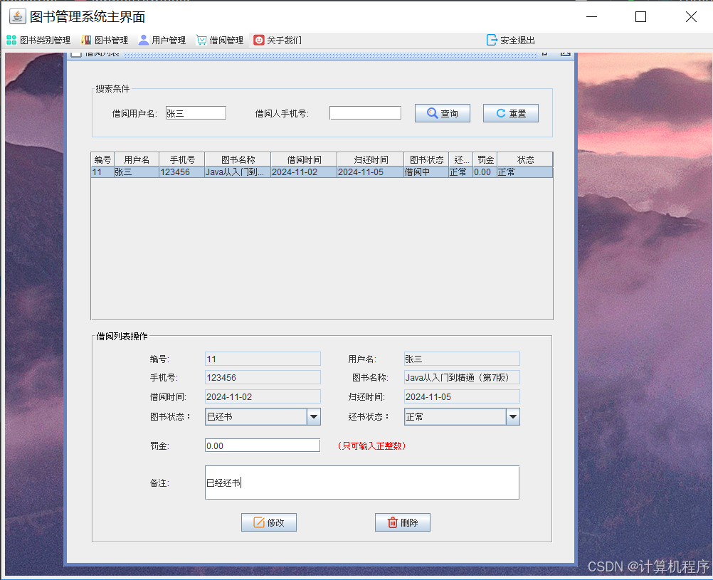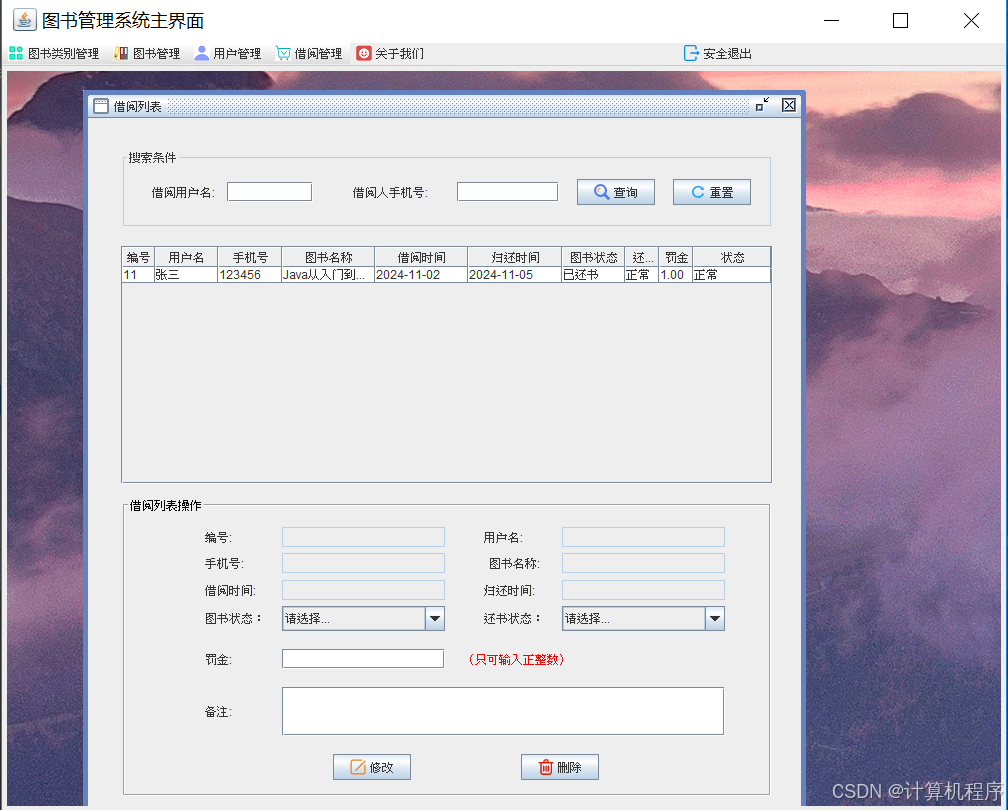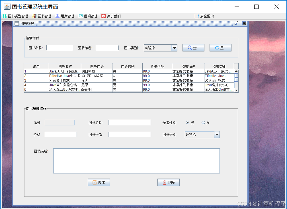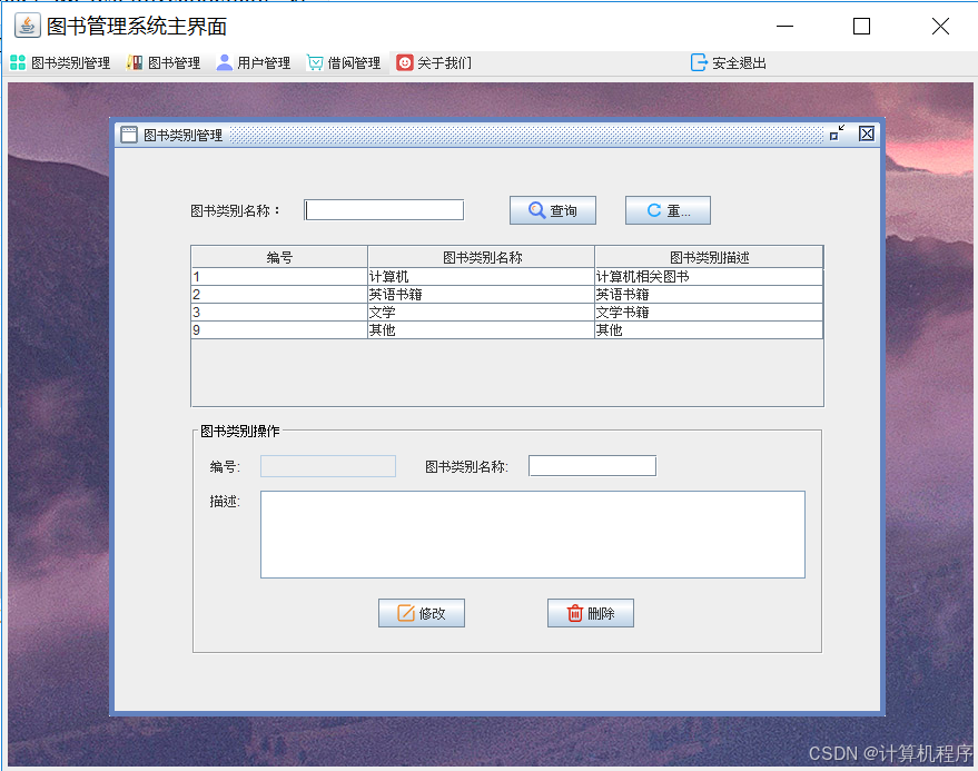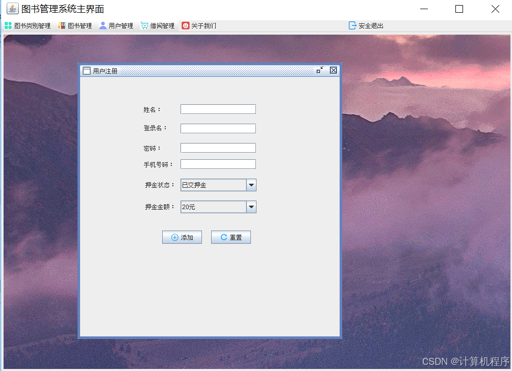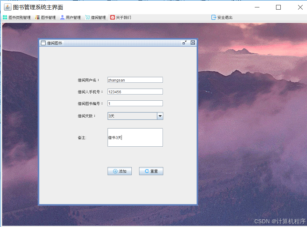 前段时间各种各样的事情太忙,优快云博客停止有很长一段时间了。今天为大家分享一个JAVA窗体版本的图书管理系统493.目前基于Swing的窗体程序使用越来越少。但是通过窗体程序涉及到的技术在各种应用程序中都有广泛的应用。本次介绍的图书管理系统涉及到数据库技术、UI技术、多线程技术等,是一个实战性很强的项目。本次介绍的图书管理系统具备的功能包括:登陆、注册、图书分类管理、图书管理、用户管理、借阅图书、归还图书、借阅清单查看、关于系统。整个项目有完整得源码,希望大家可以喜欢。通过实战项目,喜欢上编程,提高编程水平,一起加油!