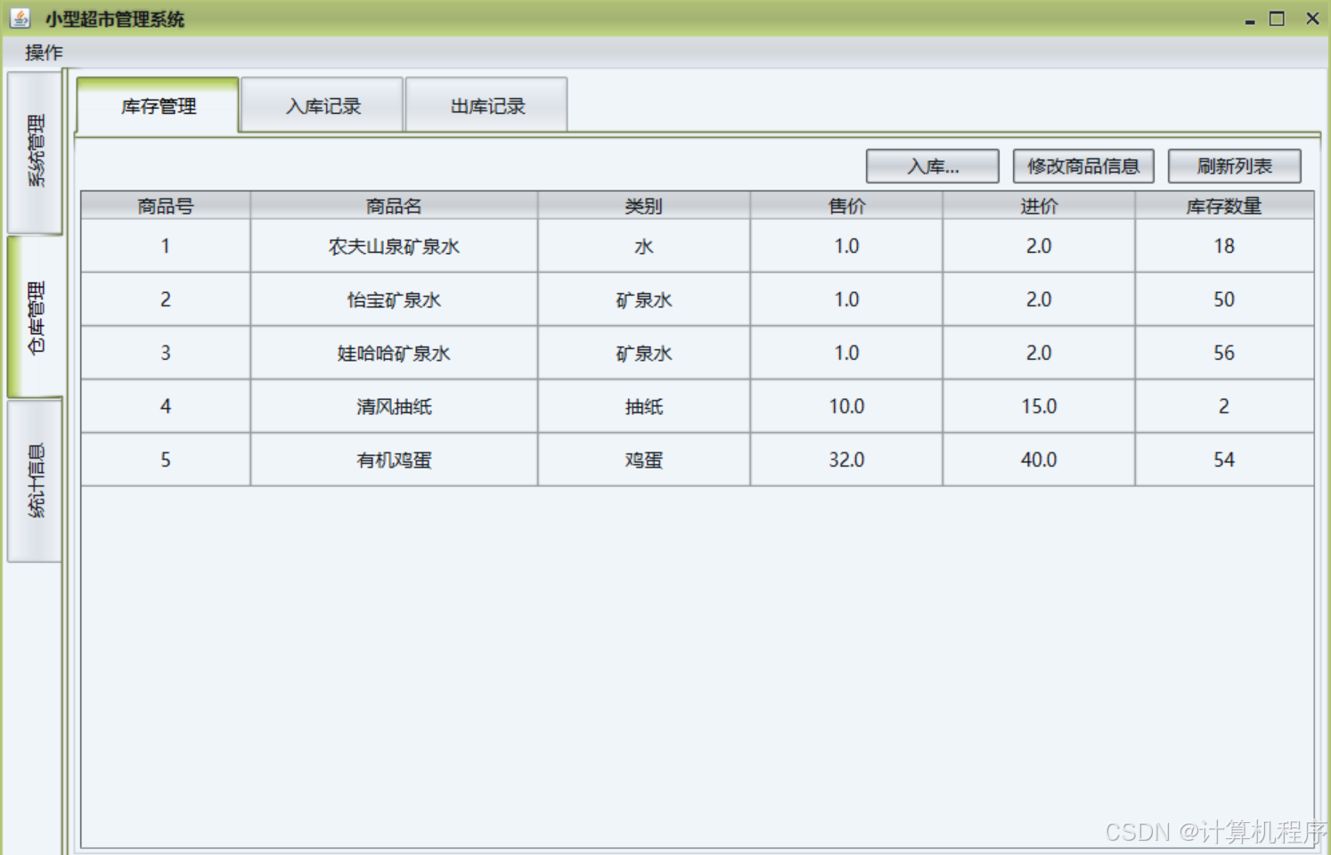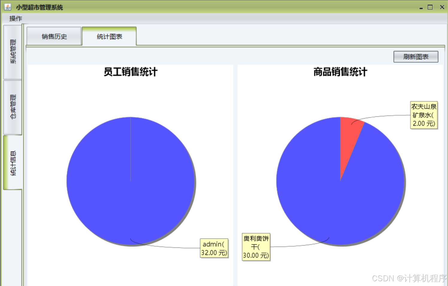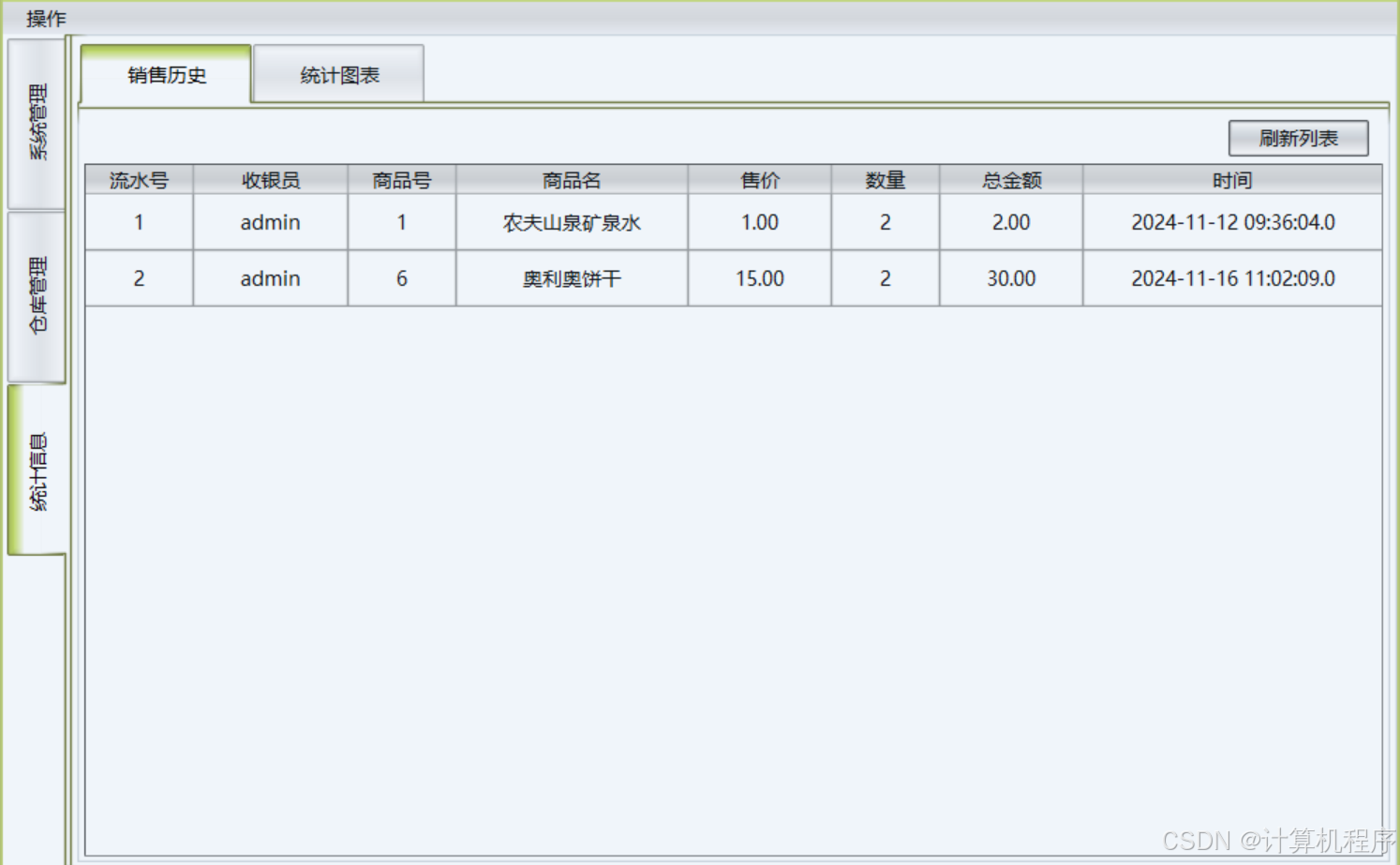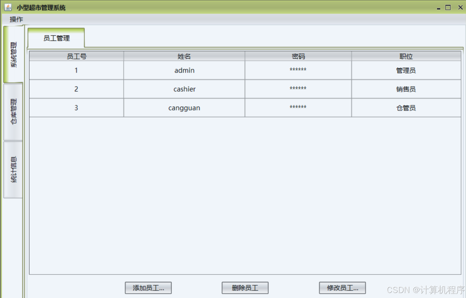 前段时间各种各样的事情太忙,优快云博客停止有很长一段时间了。今天为大家分享一个JAVA窗体版本的.目前基于Swing的窗体程序使用越来越少。但是通过窗体程序涉及到的技术在各种应用程序中都有广泛的应用。本次介绍的小型超市管理系统涉及到数据库技术、UI技术、多线程技术等,是一个实战性很强的项目。本次介绍的小型超市管理系统分销售员和系统管理员、仓库管理员三种用户类型。销售员的功能包括:登陆、查询商品、商品销售、支付、销售历史查询、销售统计分析;仓库管理员的功能包括:登陆、商品采购入库、商品退库、查询库存、历史入库退库订单。系统管理员除去了拥有销售员、仓库管理员的所有功能外,还拥有用户管理、仓库管理的功能。整个项目有完整得源码,希望大家可以喜欢。通过实战项目,喜欢上编程,提高编程水平,一起加油!