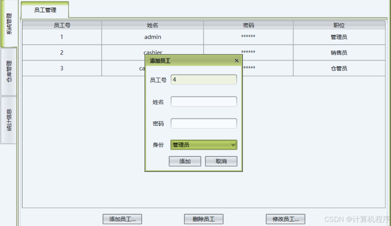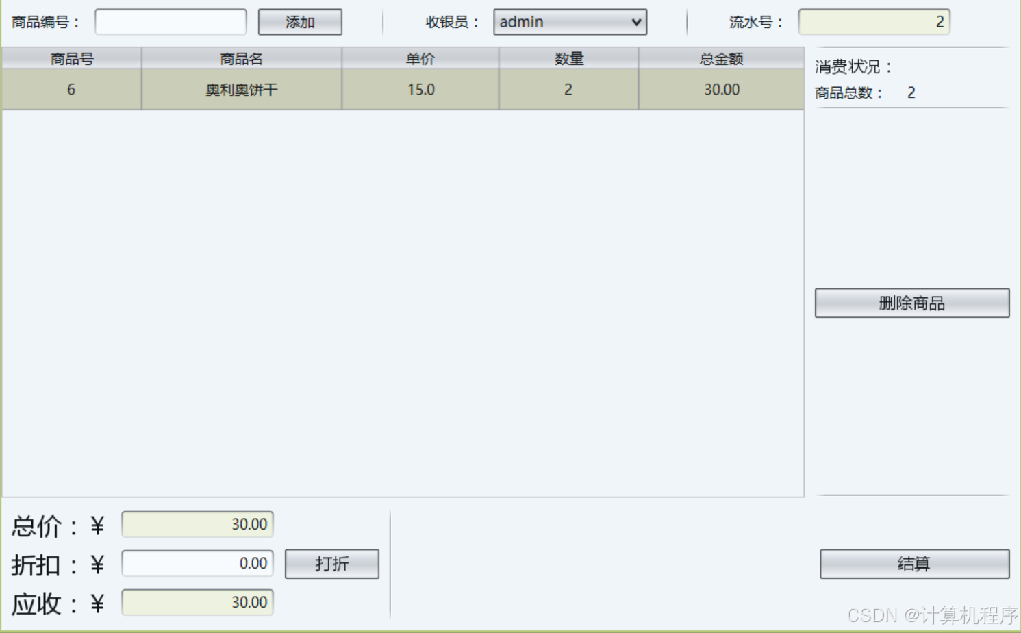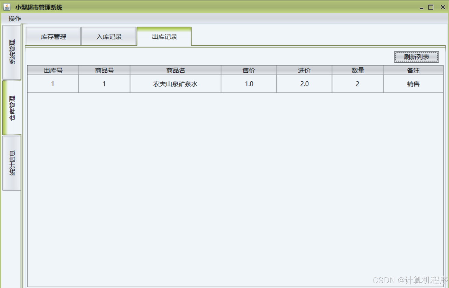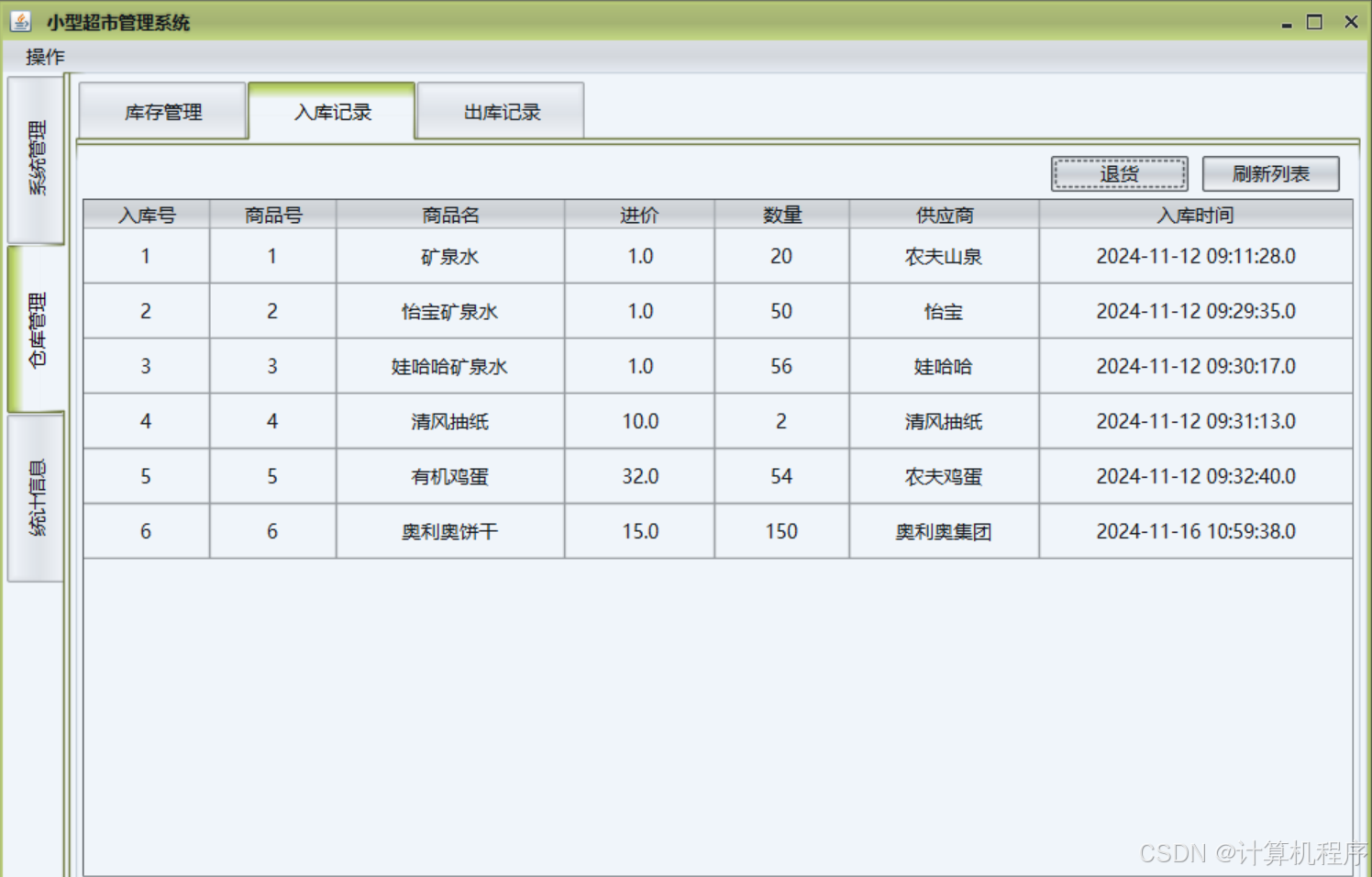 前段时间各种各样的事情太忙,优快云博客停止有很长一段时间了。今天为大家分享一个JAVA窗体版本的.目前基于Swing的窗体程序使用越来越少。但是通过窗体程序涉及到的技术在各种应用程序中都有广泛的应用。本次介绍的小型超市管理系统涉及到数据库技术、UI技术、多线程技术等,是一个实战性很强的项目。本次介绍的小型超市管理系统分销售员和系统管理员、仓库管理员三种用户类型。销售员的功能包括:登陆、查询商品、商品销售、支付、销售历史查询、销售统计分析;仓库管理员的功能包括:登陆、商品采购入库、商品退库、查询库存、历史入库退库订单。系统管理员除去了拥有销售员、仓库管理员的所有功能外,还拥有用户管理、仓库管理的功能。整个项目有完整得源码,希望大家可以喜欢。通过实战项目,喜欢上编程,提高编程水平,一起加油!