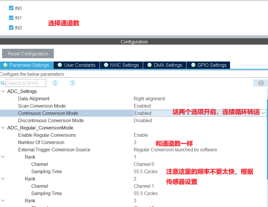 解决方案登场: 提出ADC多通道扫描 + 连续转换模式 + DMA转运的组合拳。