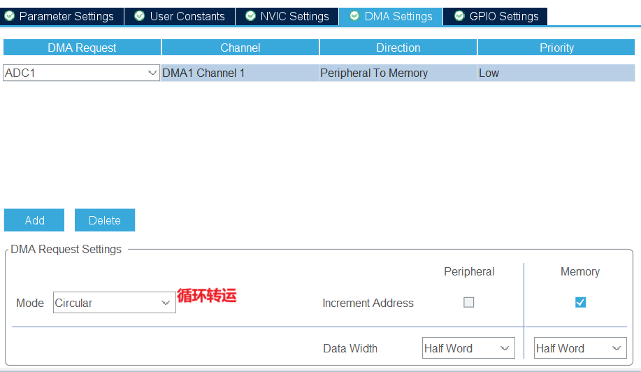 开启循环转运,其他的都是默认配置,具体设置就是循环从寄存器搬运出数据