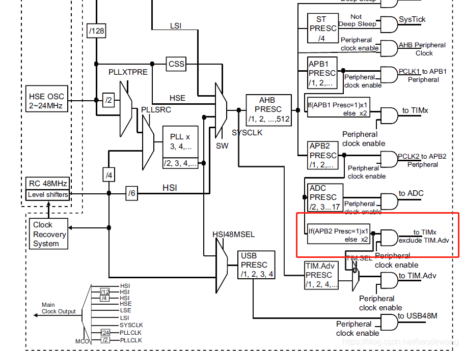 整个操作还是比较简单,只是关于TIM14的时钟频率问题,掉到了坑里。由于灵动微的手册中并没有详细描述各个外设模块的时钟源,而在APB2ENR寄存器中看到使能位,导致误以为其时钟为PCLK2是TIM14的时钟。而实际TIM14的时钟源如下图,