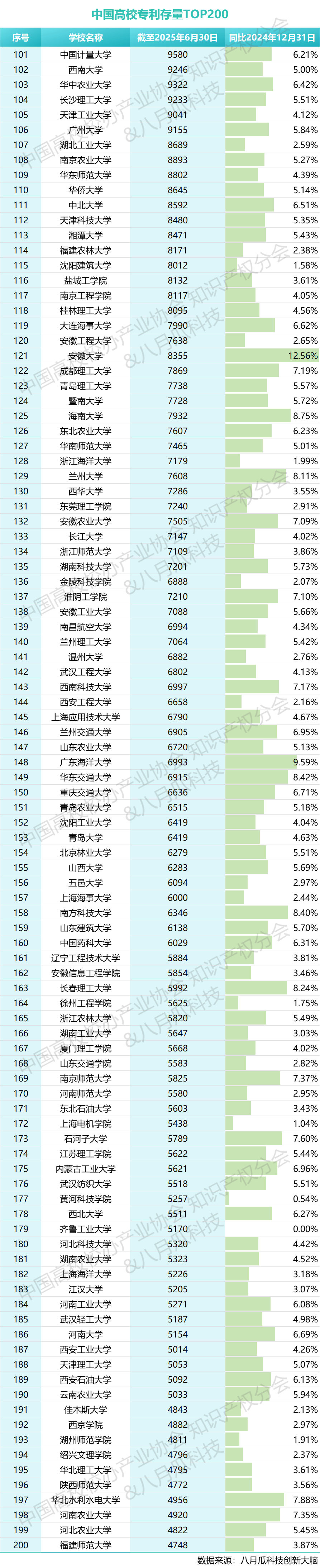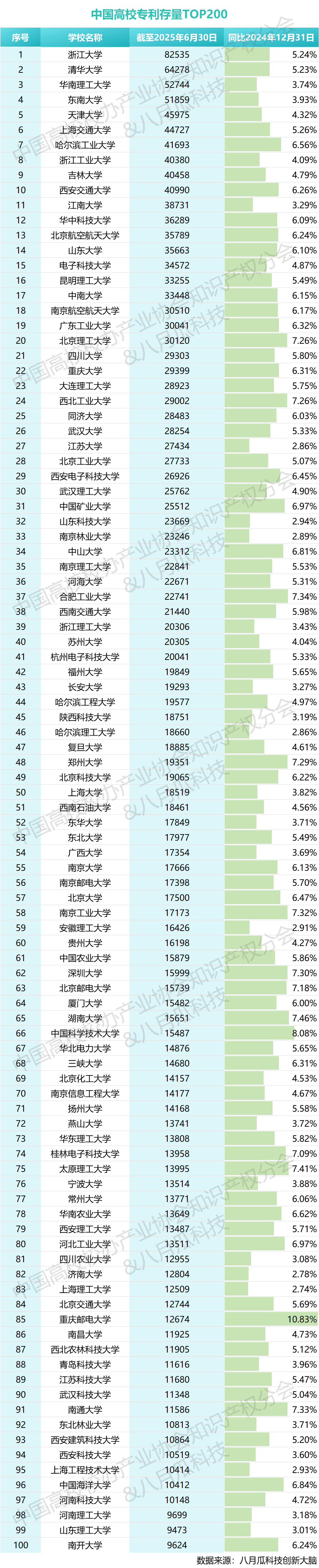 中国高校专利存量TOP200中,97家超1万件,较去年底,增长率最高的为安徽大学12.56%,增长数最高的为浙江大学4111件。