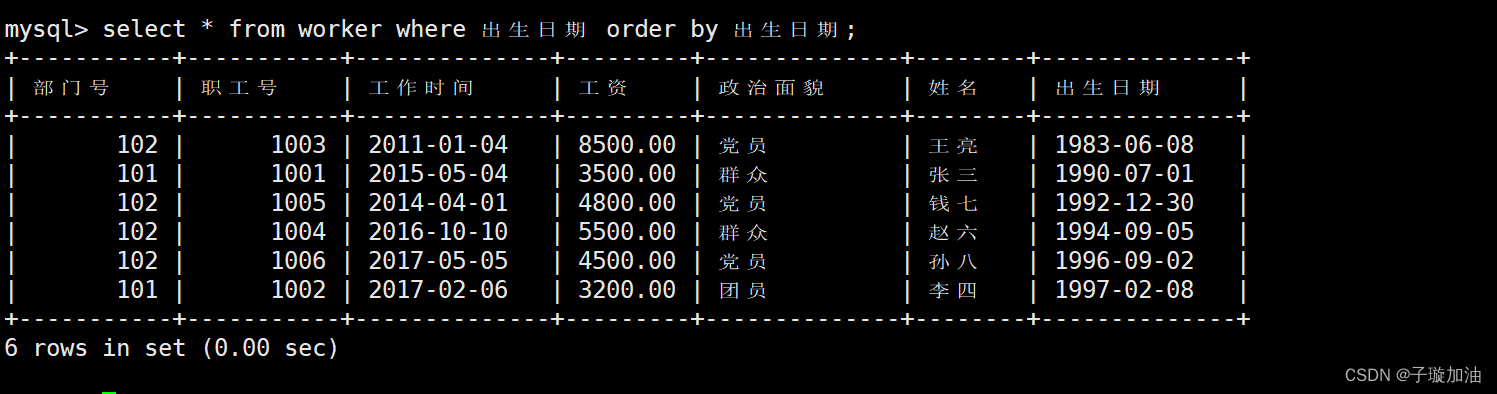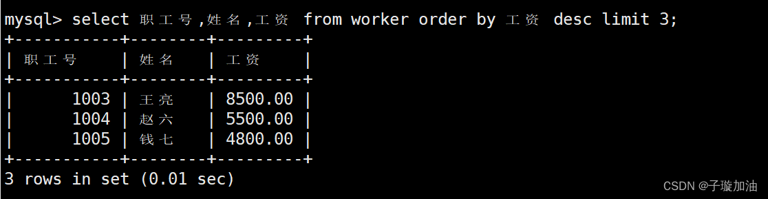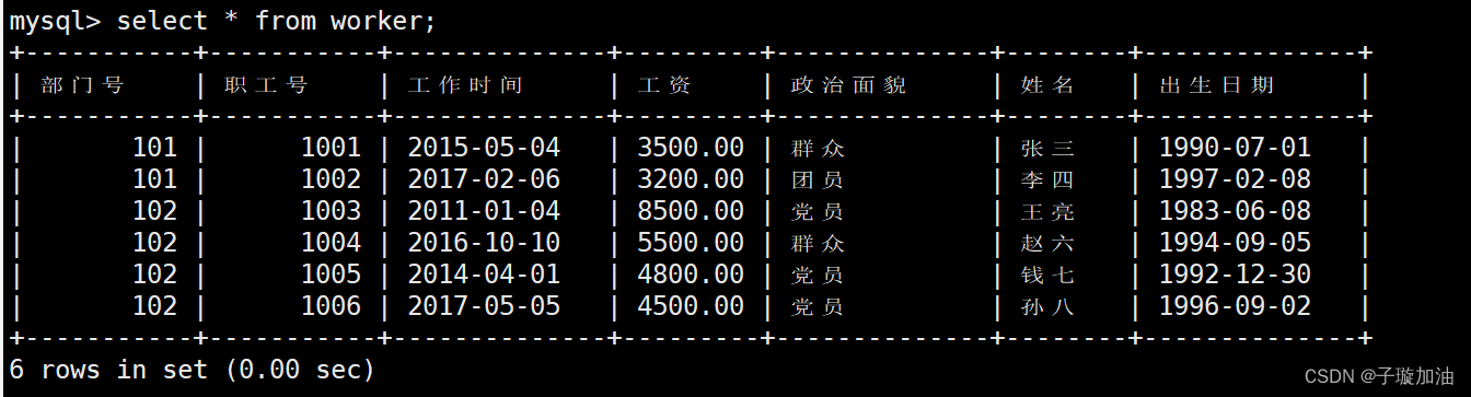 素材: 表名:worker-- 表中字段均为中文,比如 部门号 工资 职工号 参加工作 等