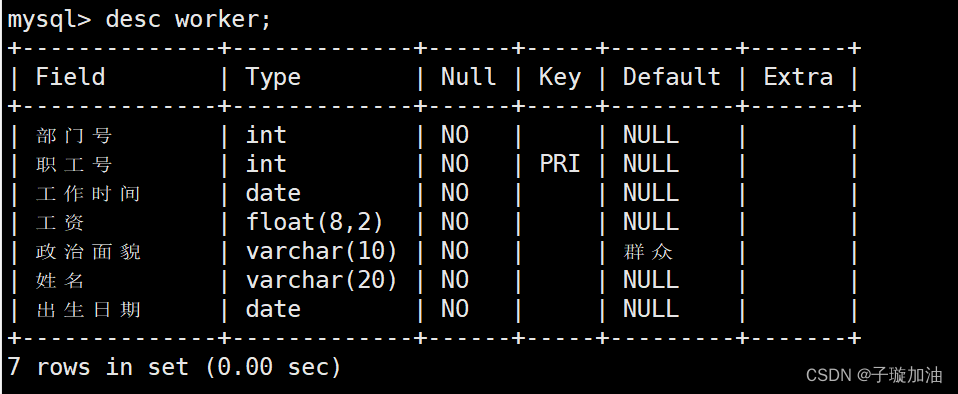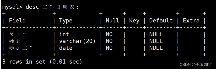 `工作时间` date NOT NULL,