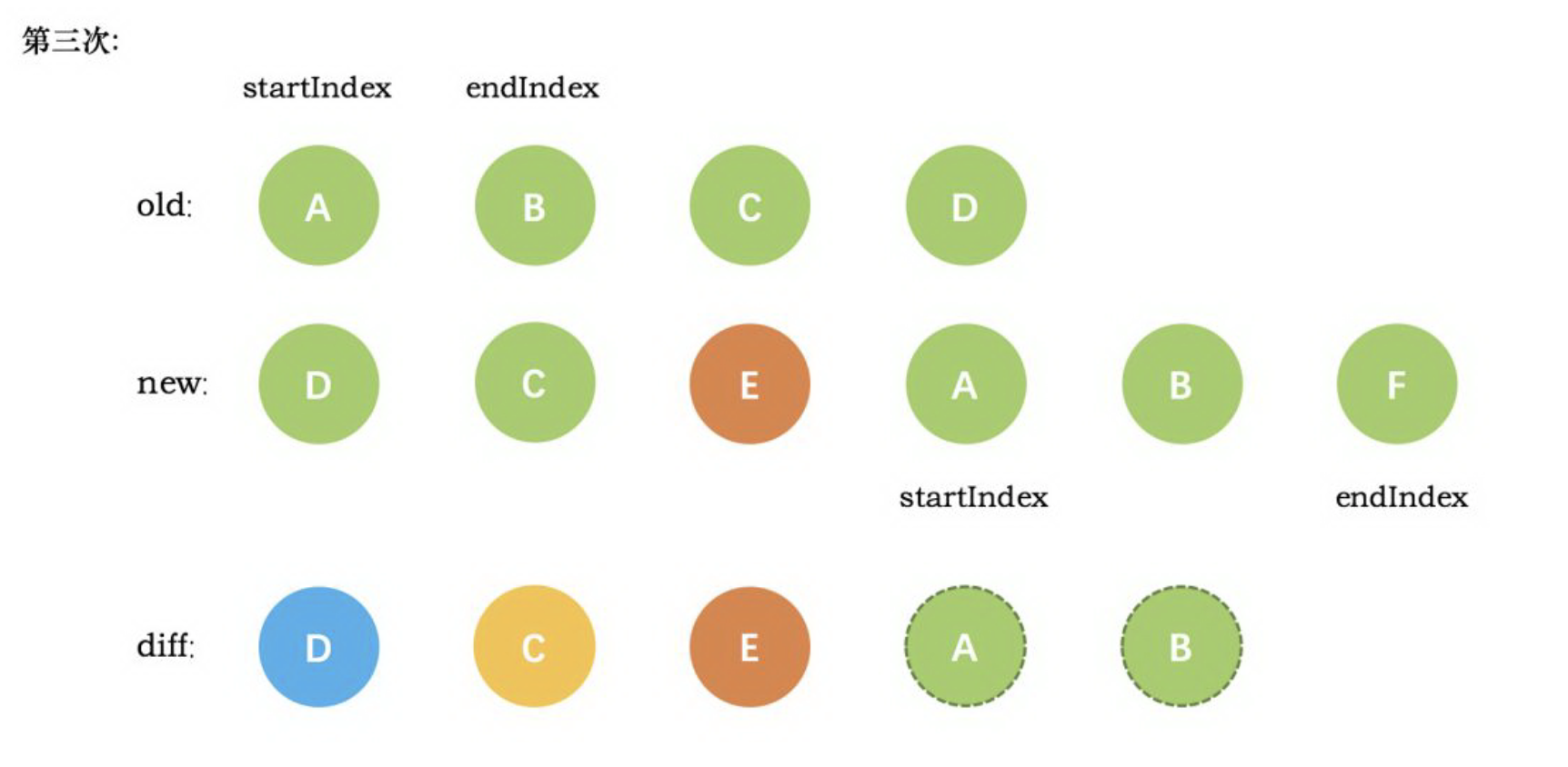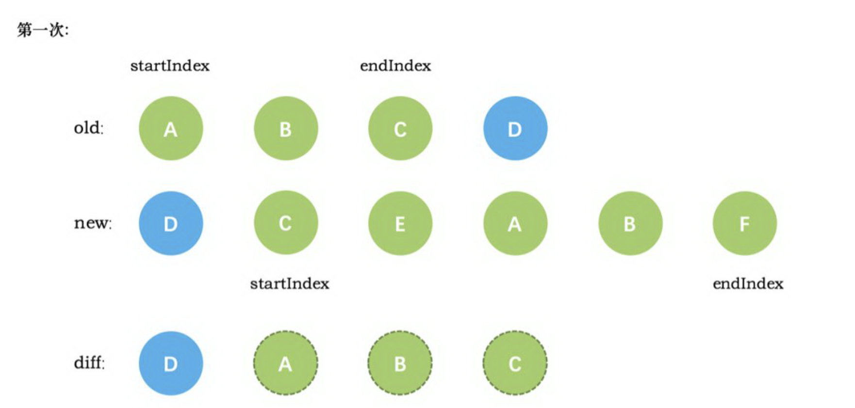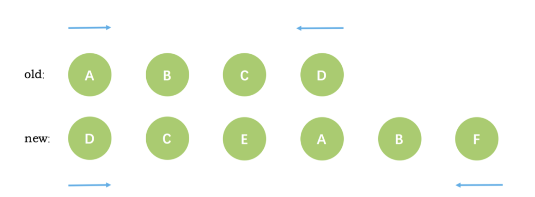 oldCh和newCh各有两个头尾的变量StartIdx和EndIdx,它们的2个变量相互比较,一共有4种比较方式。如果4种比较都没匹配,如果设置了key,就会用key进行比较,在比较的过程中,变量会往中间靠,一旦StartIdx>EndIdx表明oldCh和newCh至少有一个已经遍历完了,就会结束比较,这四种比较方式就是首、尾、旧尾新头、旧头新尾