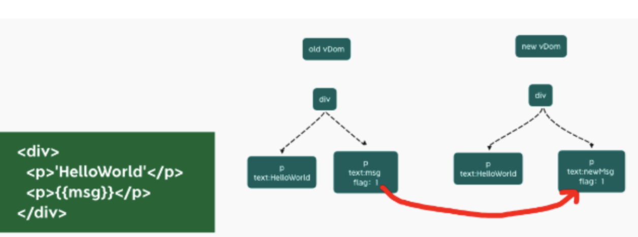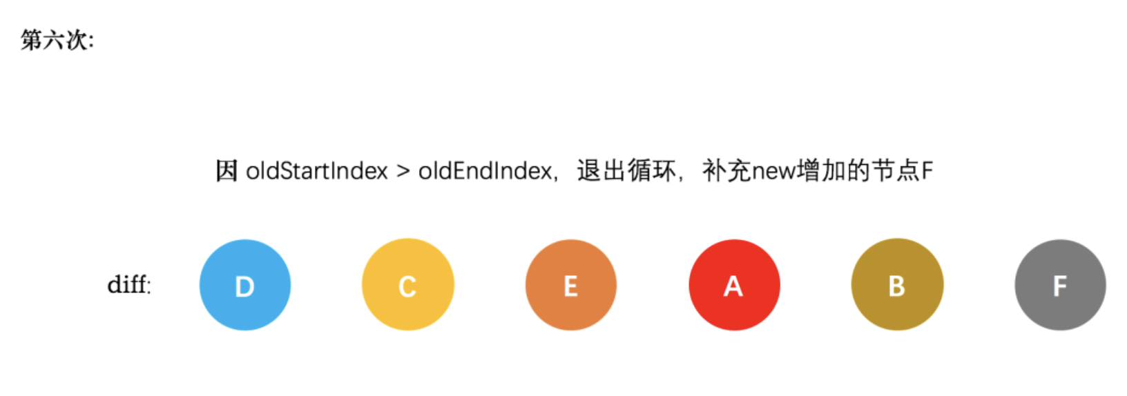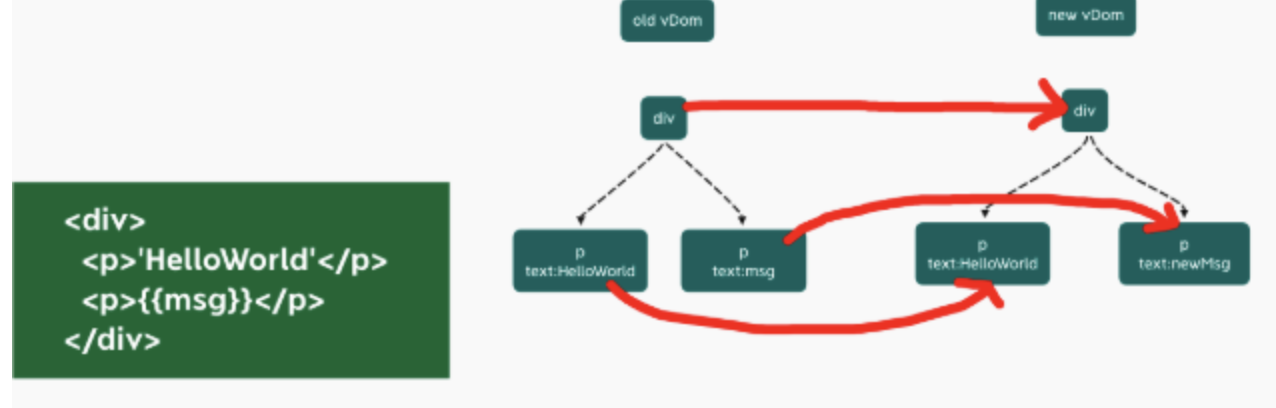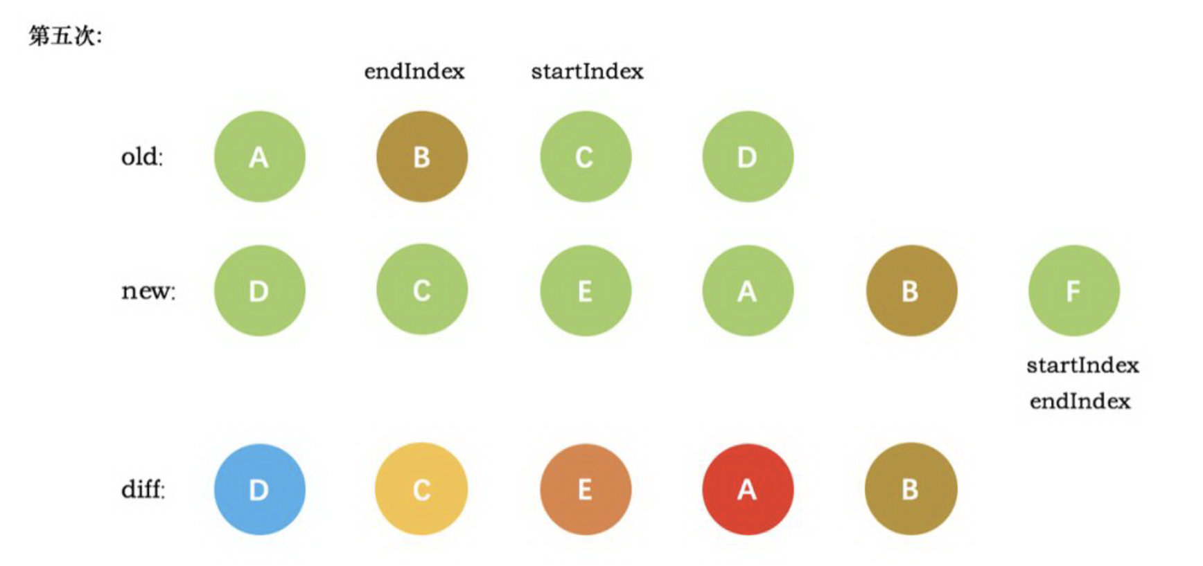 oldCh和newCh各有两个头尾的变量StartIdx和EndIdx,它们的2个变量相互比较,一共有4种比较方式。如果4种比较都没匹配,如果设置了key,就会用key进行比较,在比较的过程中,变量会往中间靠,一旦StartIdx>EndIdx表明oldCh和newCh至少有一个已经遍历完了,就会结束比较,这四种比较方式就是首、尾、旧尾新头、旧头新尾