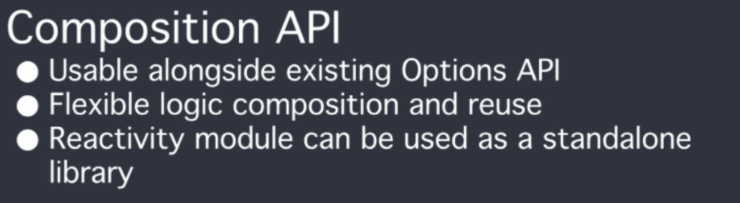 - 由于 Options API 不够灵活的开发方式,使得Vue开发缺乏优雅的方法来在组件间共用代码。