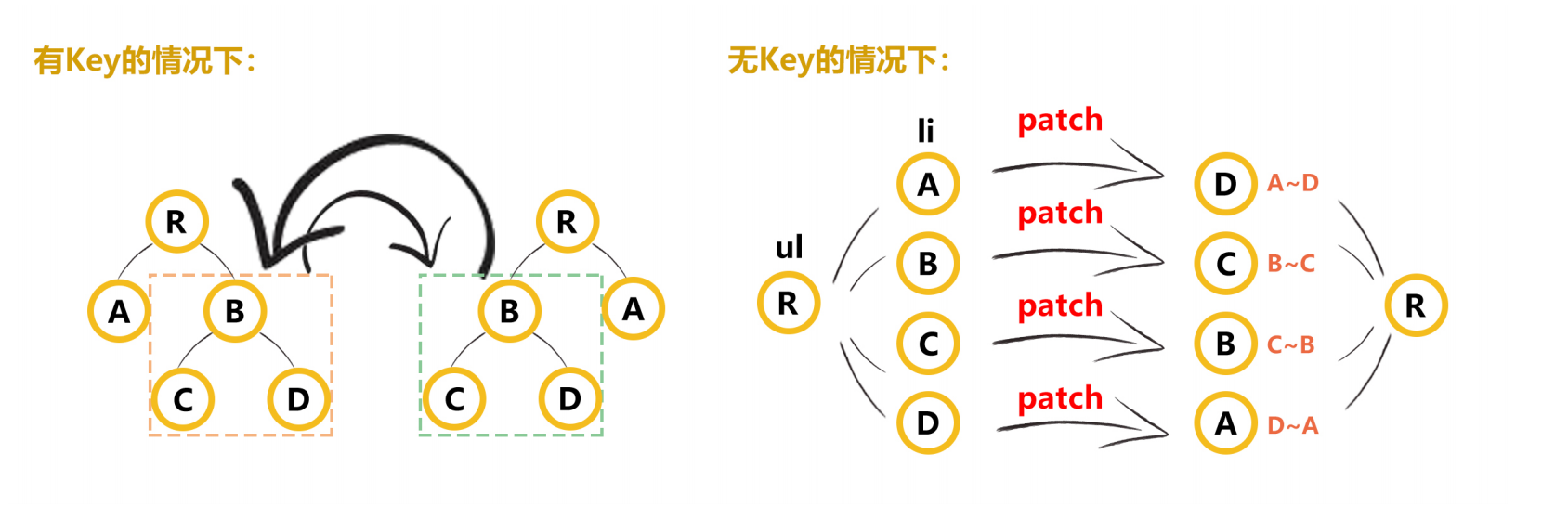 key就不是就地复用了,在sameNode函数a.key === b.key对比中可以避免就地复用的情况。所以会更加准确。 - 更快速 :