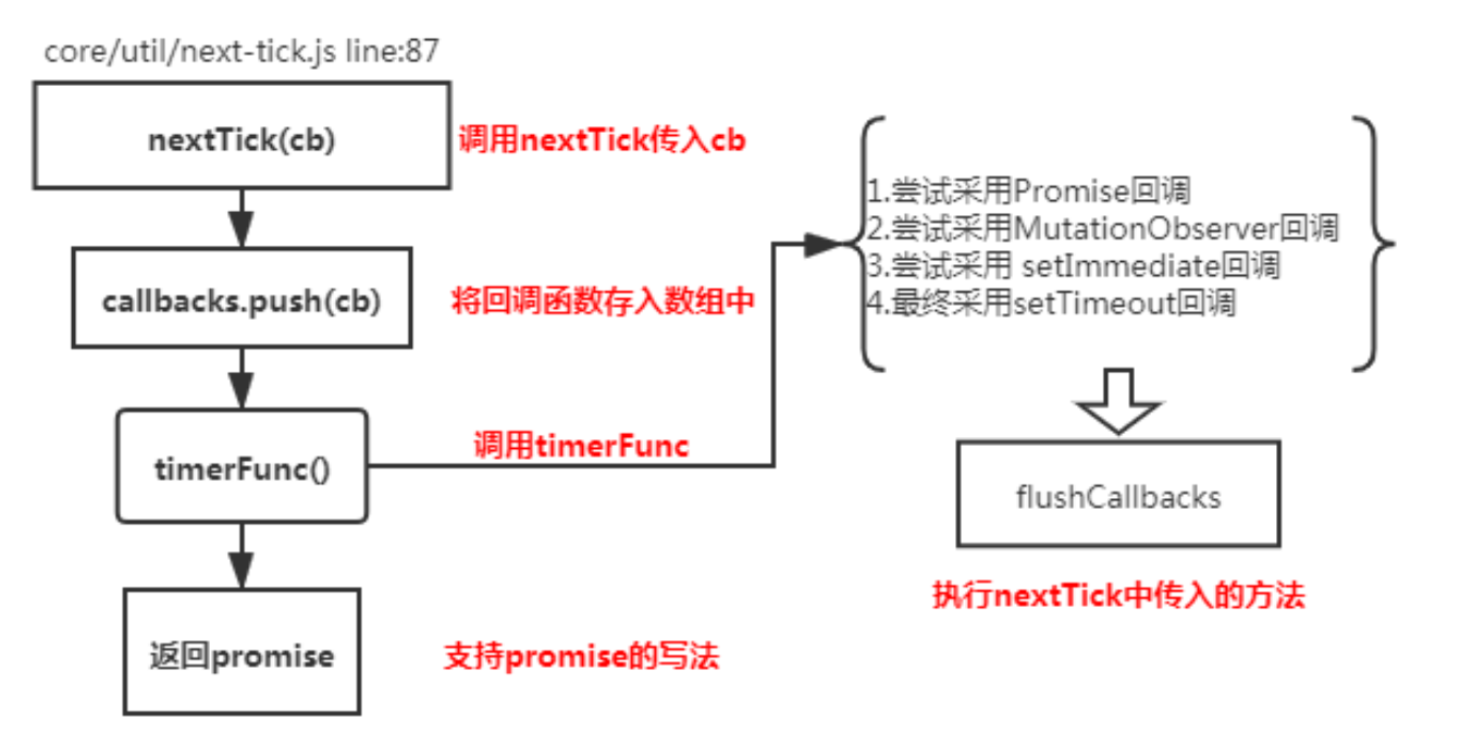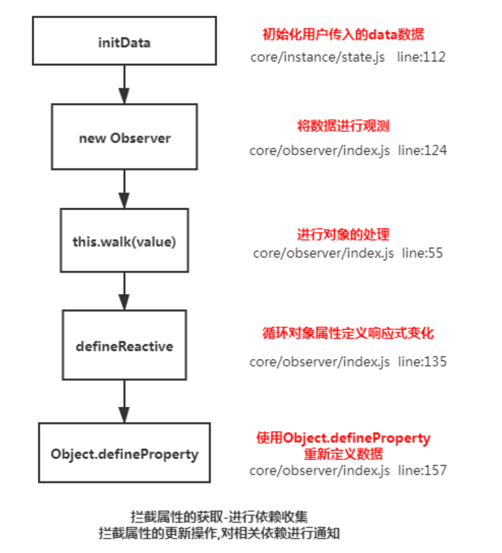 具体的过程:首先Vue使用 initData 初始化用户传入的参数,然后使用 new Observer 对数据进行观测,如果数据是一个对象类型就会调用 this.walk(value) 对对象进行处理,内部使用 defineeReactive 循环对象属性定义响应式变化,核心就是使用 Object.defineProperty 重新定义数据。
