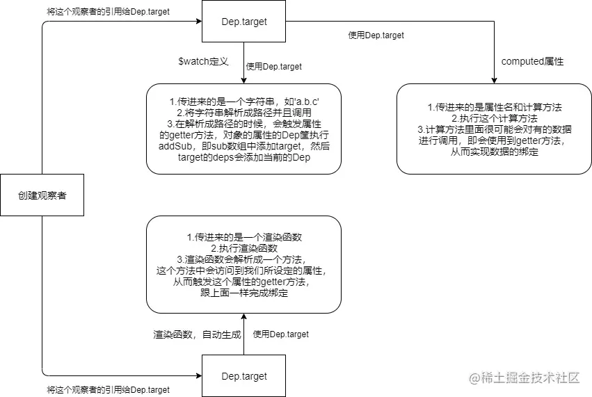 - Dep是负责存放数据所绑定所有的观察者的对象的容器,只要数据发生改变,就会通过这个Dep来通知所有观察者进行修改数据。(每个数据都有独一无二的Dep)。而Watcher更偏向于一个动作,也就是规定的业务逻辑或者渲染函数,是一个执行者。