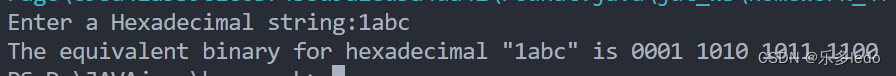 本文介绍了一个Java程序,它从控制台接收用户输入的十六进制字符串,使用给定的字符串数组将其转换为等效的二进制数。通过遍历输入字符串,将每个十六进制字符转换为对应的二进制位。
