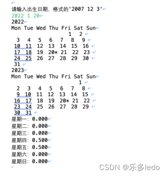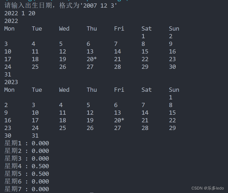 从按制台接收用户的输入的出生日期,输出从用户出生的那一年到今年为止,每年的生日当月的日历,生日当天标*号,并统计这么多年用户生日当天为一周中每一天的百分比(即生日为周一的在这么多年中占的百分比,生日为周二的在这么多年中占的百分比.....)