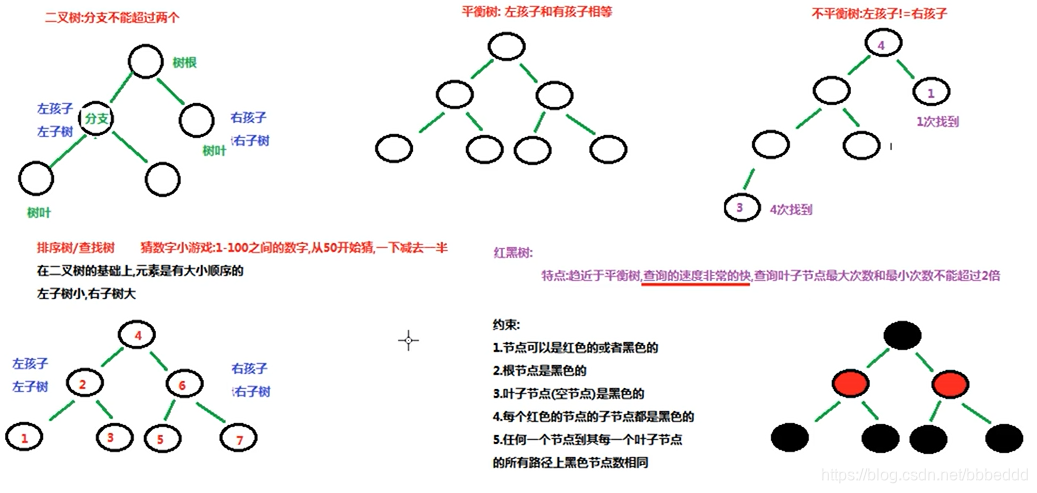 红黑树:特性趋近于平衡树(查询子结点的速度差,不能超过二倍)。有约束条件