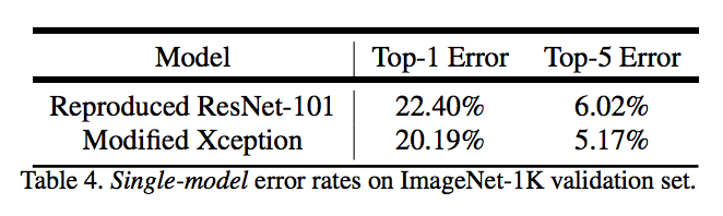 论文提出的模型在主干网络 ResNet-101 和 Xception均进行验证。两种方式均在 ImageNet 预训练。其中 Xception 预训练过程中,使用 50 个 GPU,每个 GPU batch size=32,分辨率 299x299。Xception 相比 ResNet-101,在 Top-1 和 Top-5 分别提高 0.75% 和 0.29%。