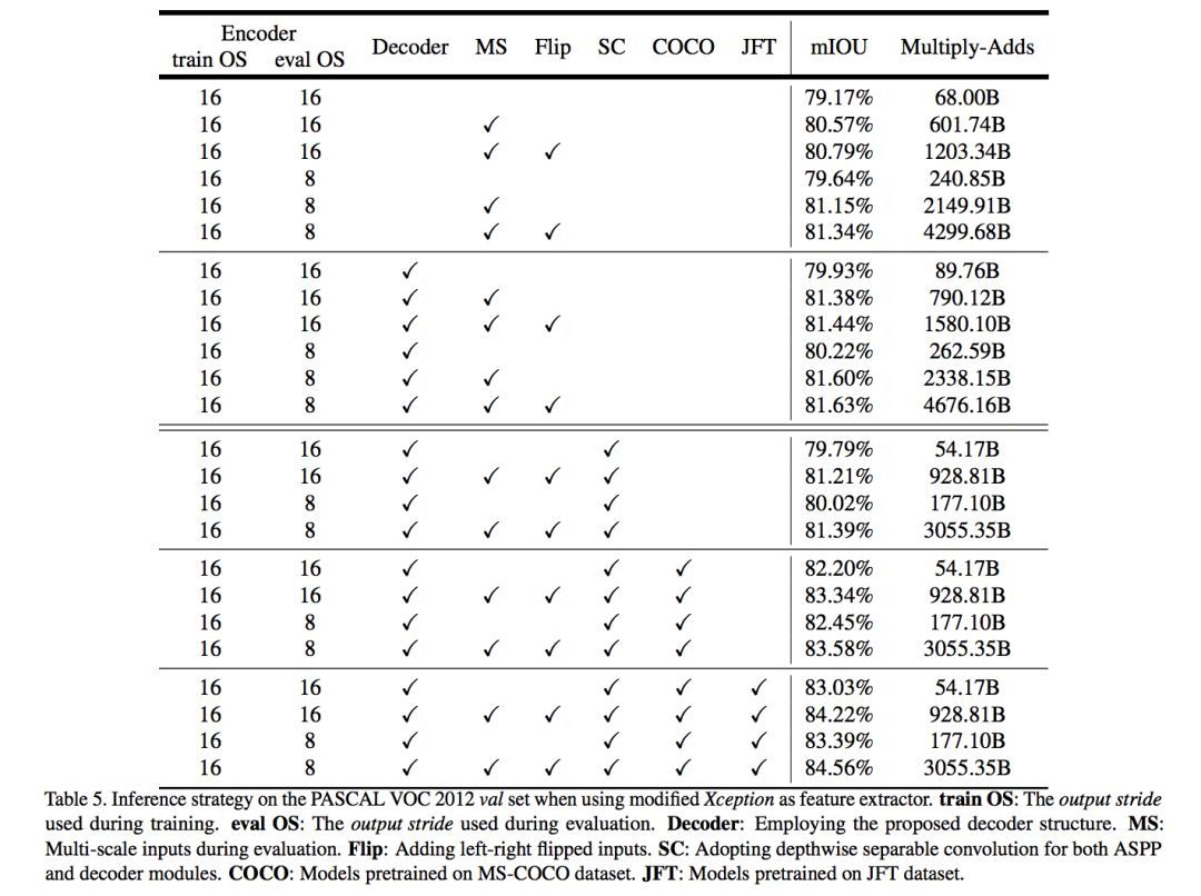 在实验过程中,分别考虑 train OS: The output stride used during training、eval OS: The output stride used during evaluation、Decoder: Employing the proposed decoder structure、MS: Multi-scale inputs during evaluation、 Flip: Adding left-right flipped inputs 等各种情况。