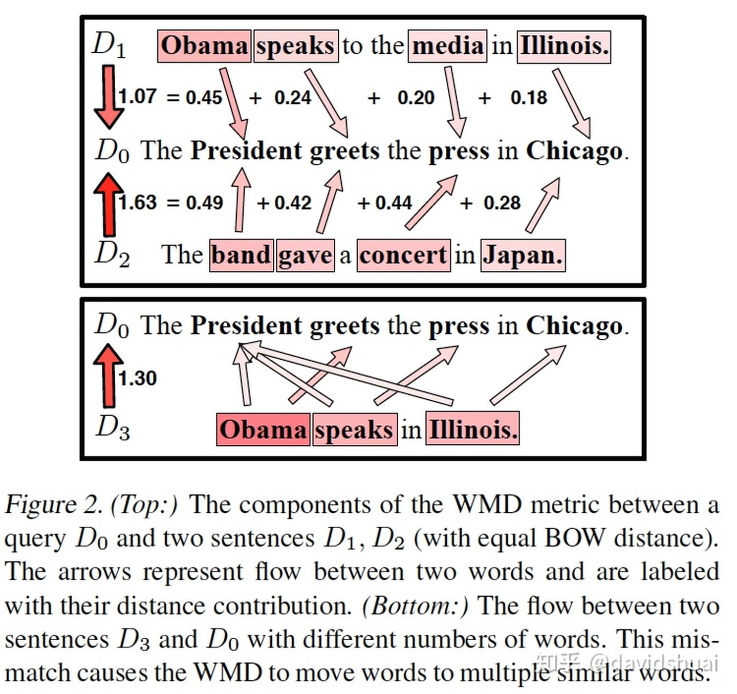 如下图所示,document1中的每一个词都找到了document2中对应的词,然后所有这些词之间的距离和即为两个文档之间的WMD。