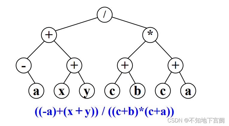 二叉树表示算术表达式:分支结点对应运算符, 叶结点对应操作数。