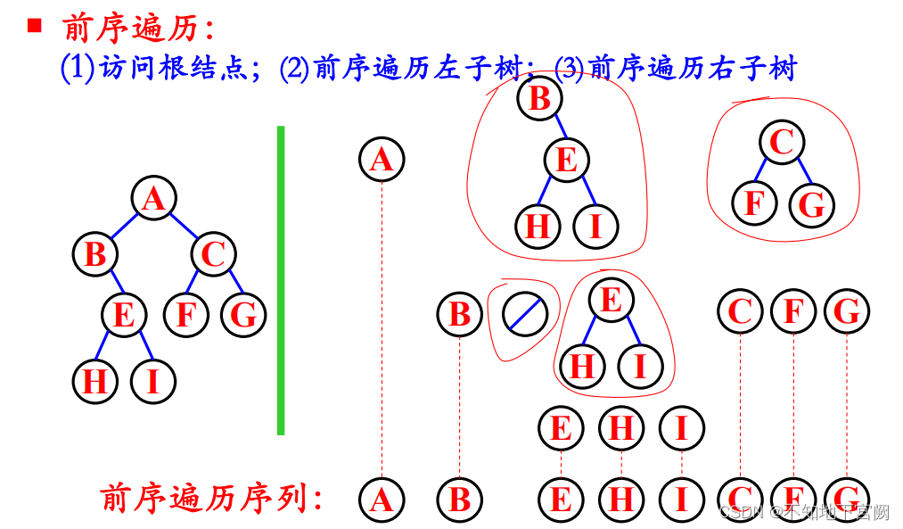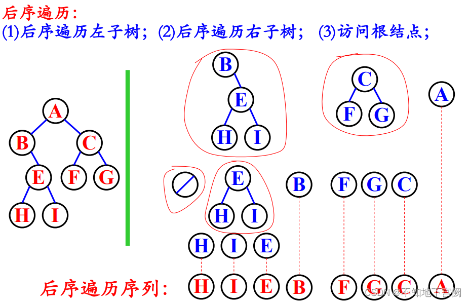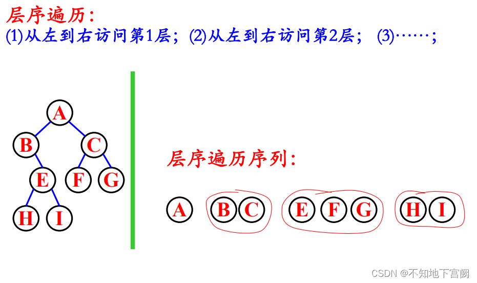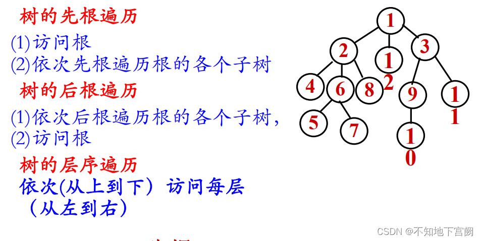 前序、中序、后序就是访问根节点的时机。层次序就是按顺序访问。