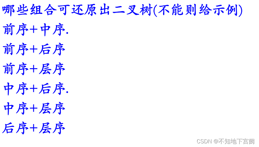 满二叉树:一棵深度为h且 有2h-1个结点的二叉树。(每 个结点的度为0或2,且度为 0的结点只出现在最后一层)