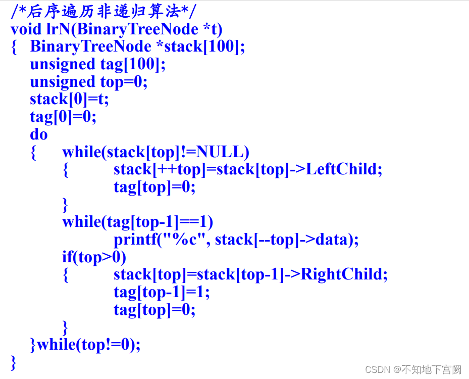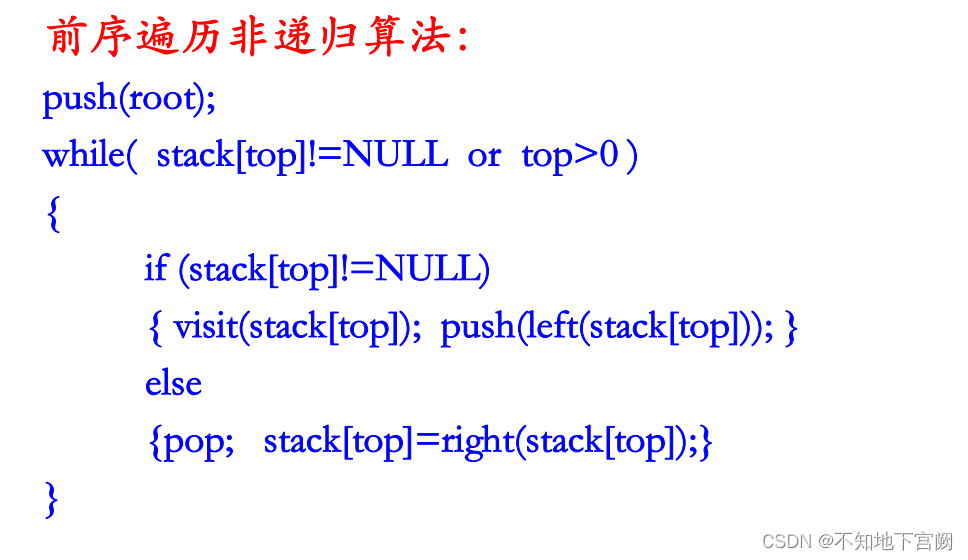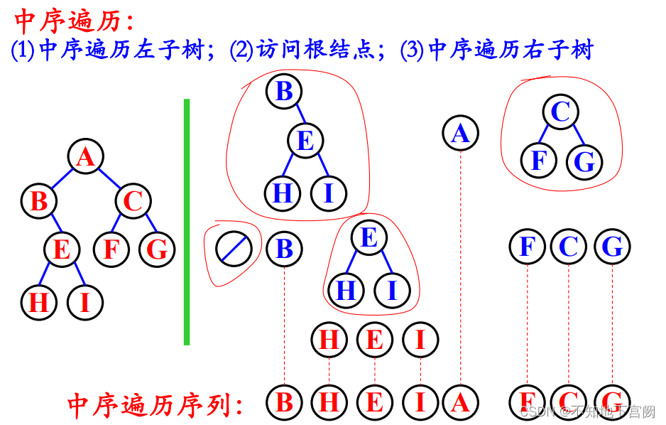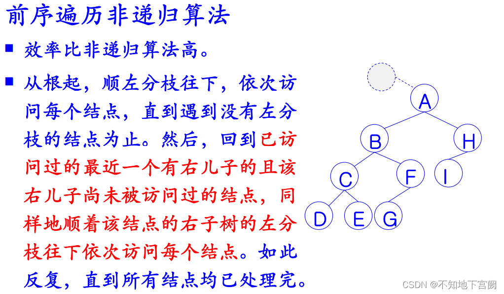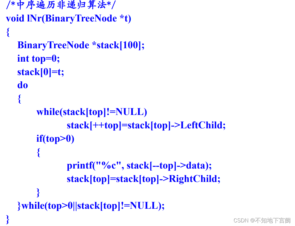 在访问完某结点后,不能立即放弃它,因 为遍历完它的左子树后,要从它的右儿子起遍历,所以在访问完某结点后,应保存它的指针,以便以后能从它找到它的右儿子。由于较先访问到的结点较后才重新利用,故应将访问到的结点按栈的方式保存