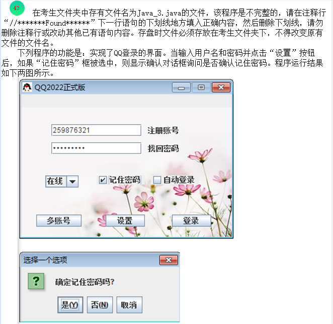 以下是Java Swing实现的模拟QQ登录界面程序,包含窗口设置、组件布局、事件监听等功能,涉及5处需要填写的空白(标记为//**********found**********):