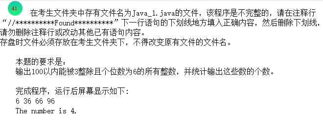 以下是Java中关于循环控制、条件判断及计数功能的基础题型,核心是找出满足特定条件的数字并统计数量,包含3处需要填写的空白(标记为//*********Found********):
